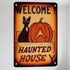 Vintage Halloween Haunted House Metal Sign - Welcome! Black Cat & Orange Pumpkin On Wooden Crate Tin Sign for Bar Pub Home Wall