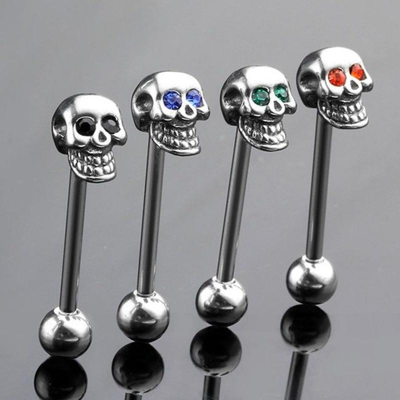 1Pcs New Stainless Steel CZ Gem Skull Silvery Tongue Barbell Ring Bar Body Piercing Myshine