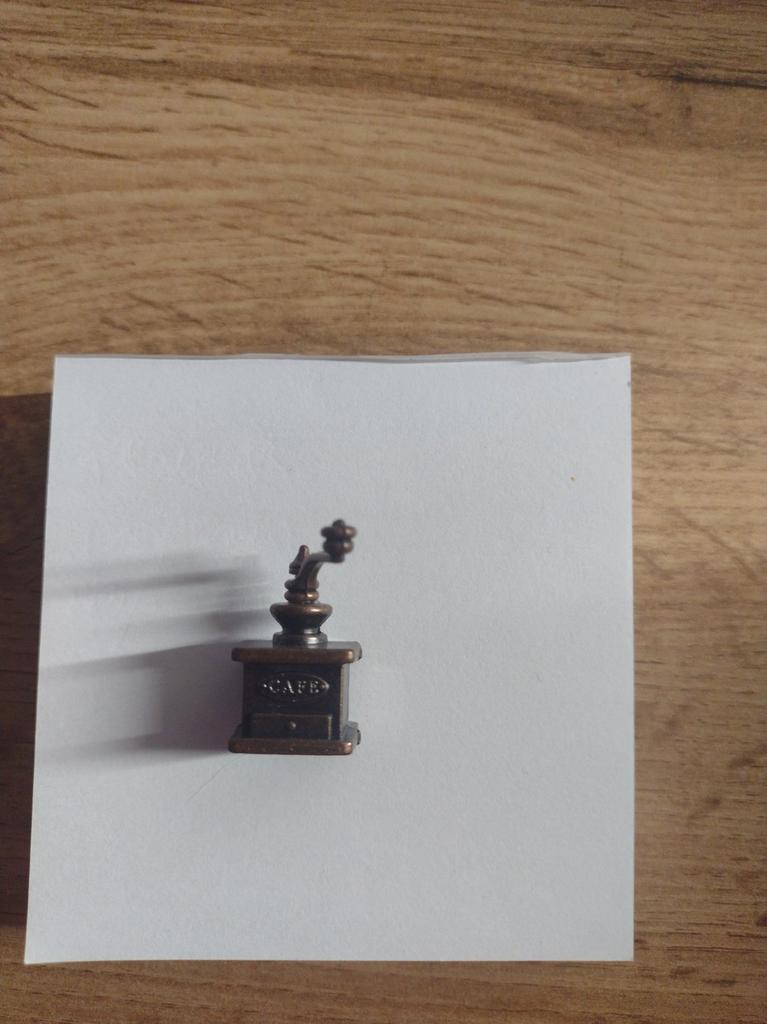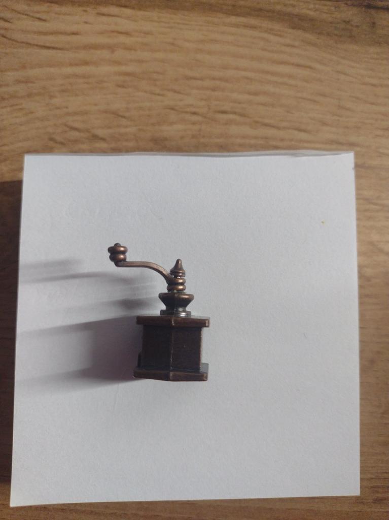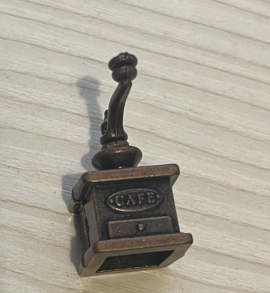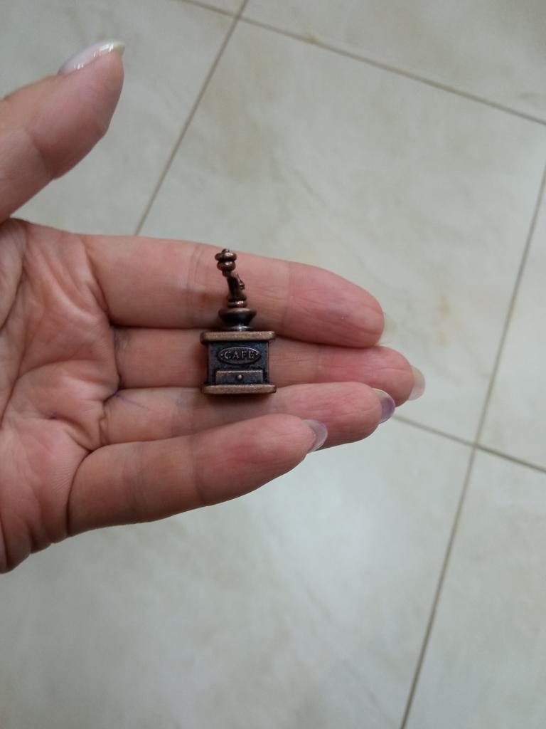 Metal coffee grinder. Miniature of the real one. The handle turns. Super. I recommend