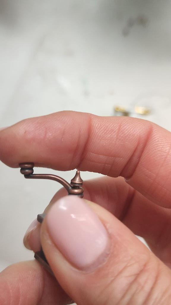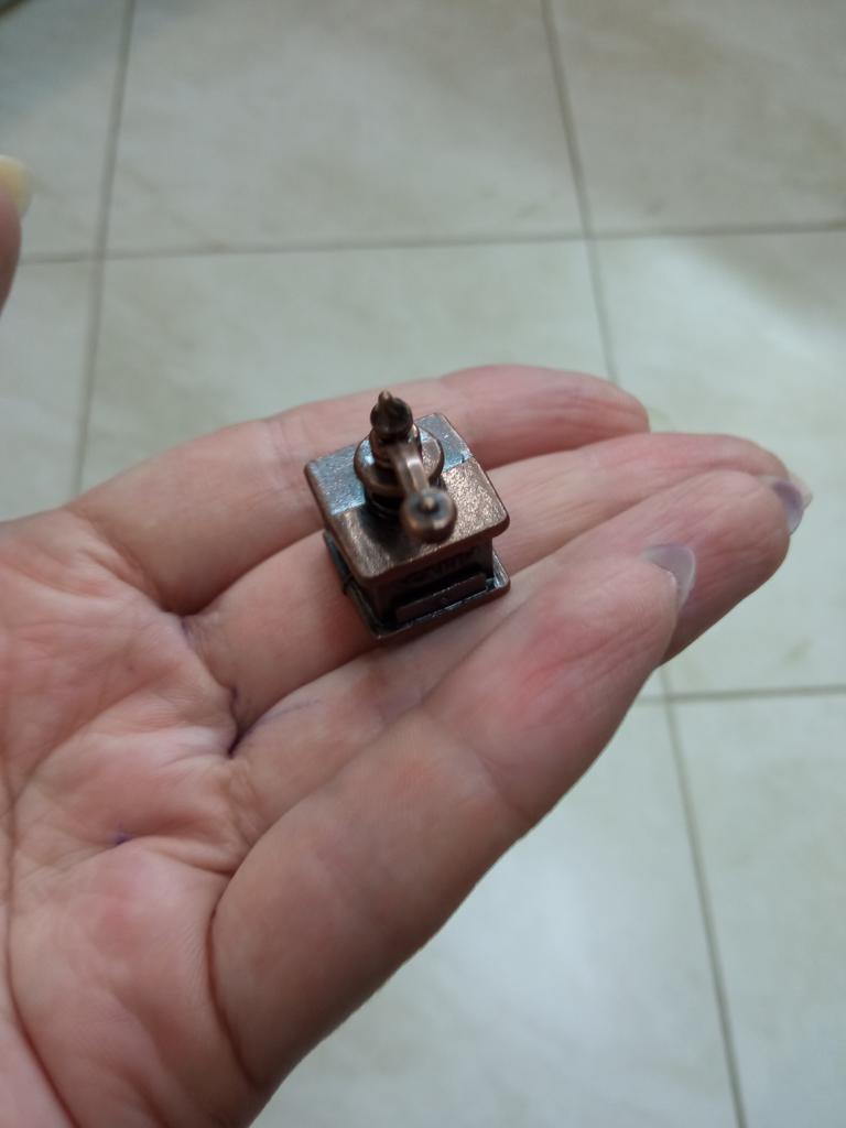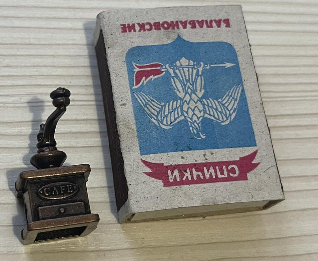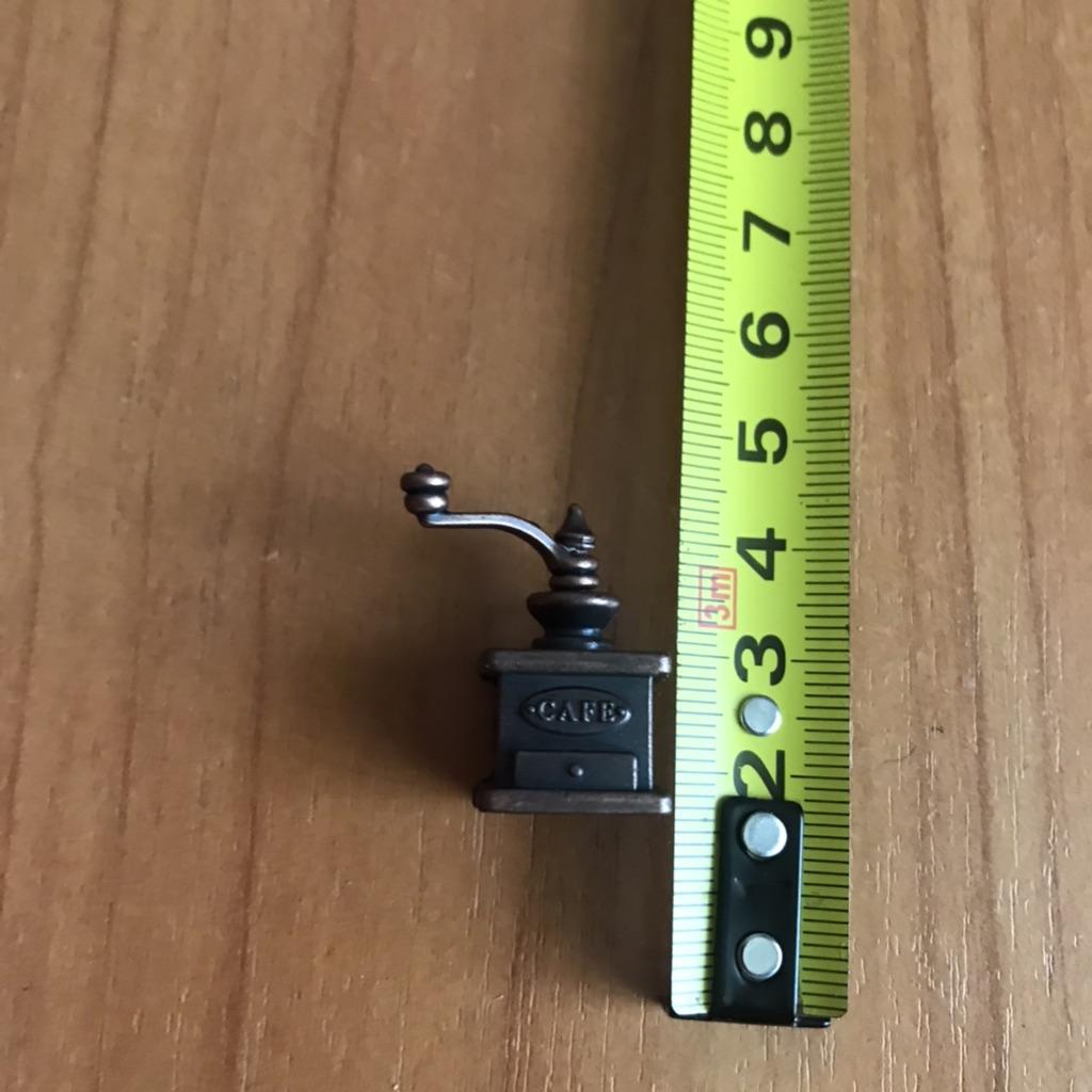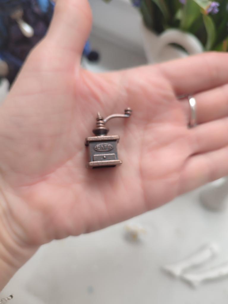 Metal coffee grinder. Miniature of the real one. The handle turns. Super. I recommend