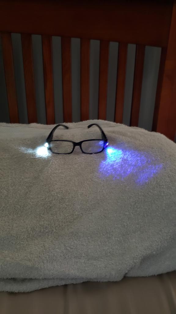 Не знаю чому ліхтарики різного кольору, але то вже нехай буде. Лінзи тут чомусь кращі ніж на звичайних дешевих окулярах, це зі слів людини для кого вони купувалися. Don't know why the lights are different in colour, but that's fine. The lenses on these are a little better than on the cheapest regular glasses, so I guess they are worth it.