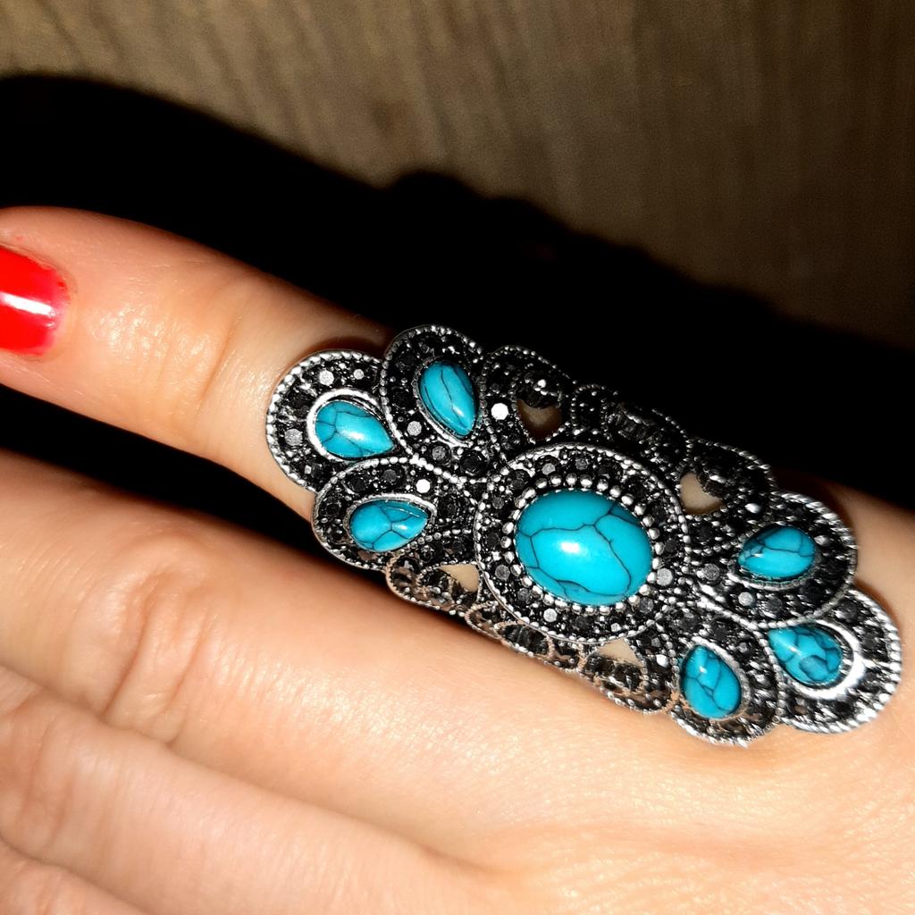 Vintage Inlaid Turquoise Crystal Stone Finger Ring Male Female Rings Hollow Party Symmetric Jewelry