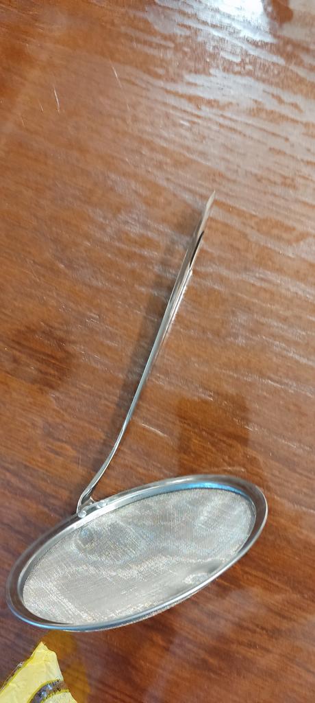 A flat strainer for collecting soup scum.