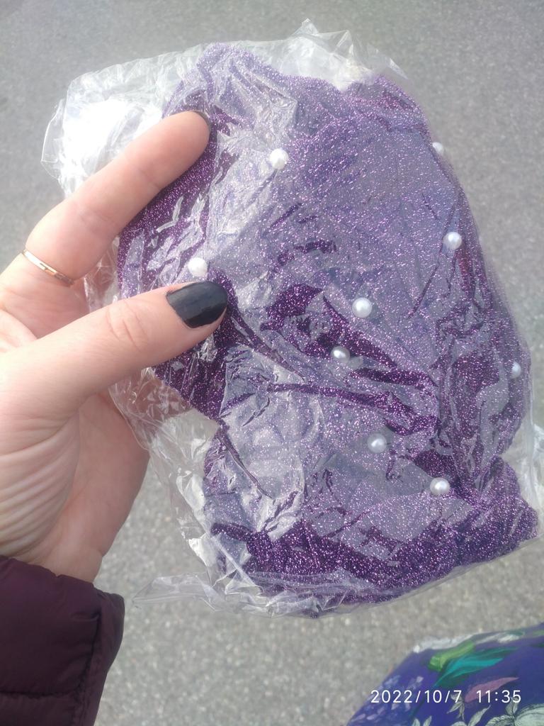 Order received very late. Some berets are better than others. Lightweight fabric. Very pretty blue and the pearls are really nice !! Thank you Joom