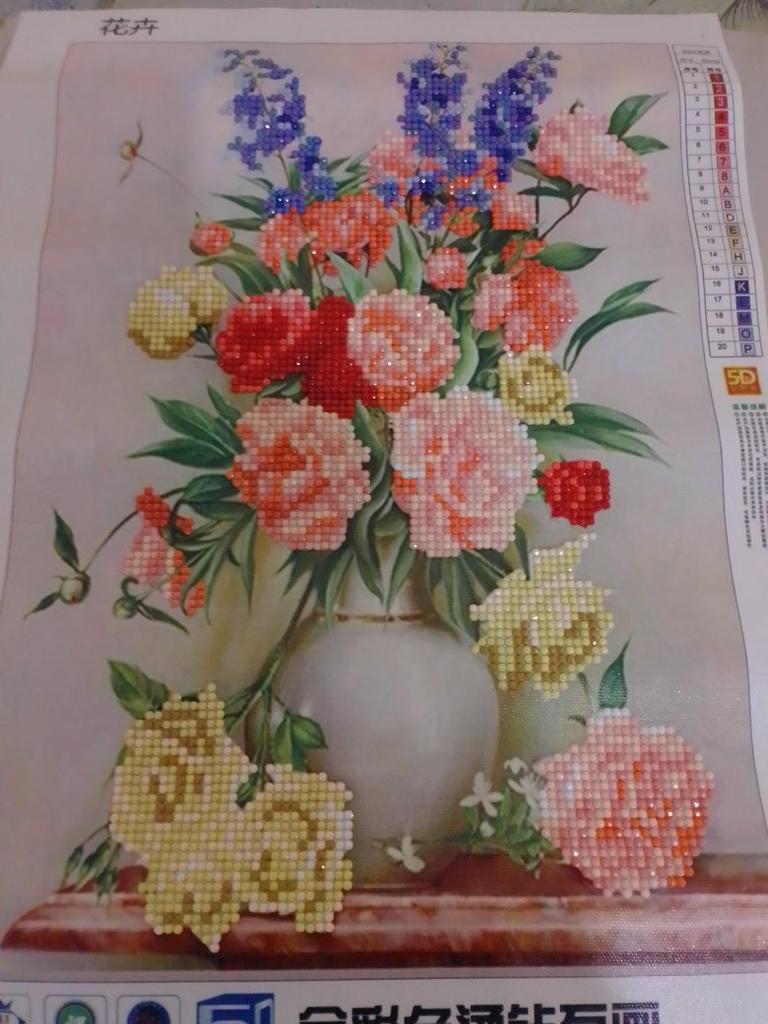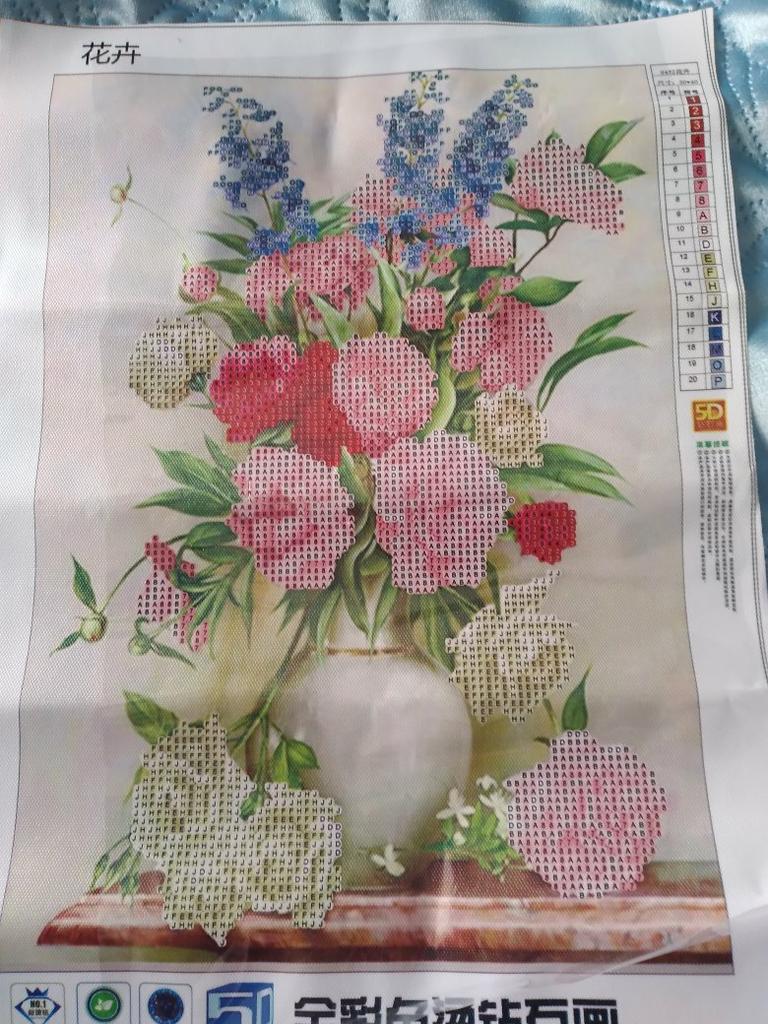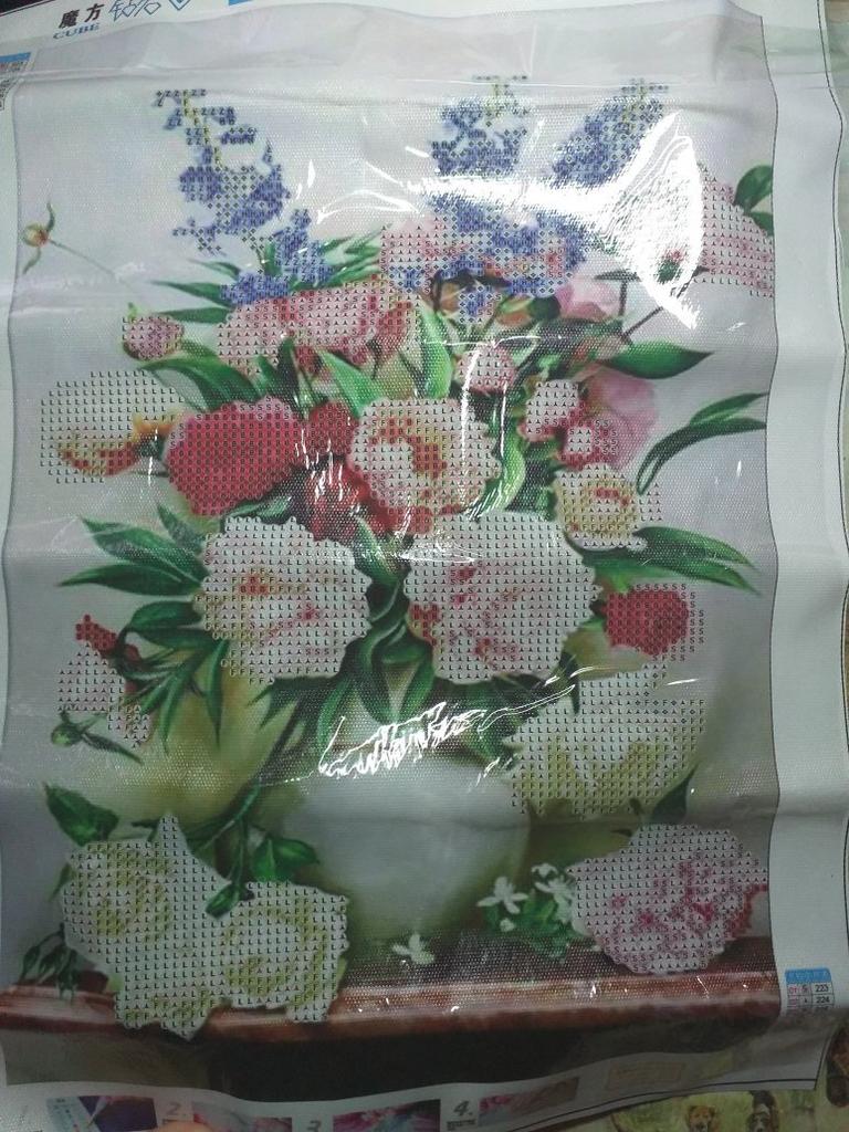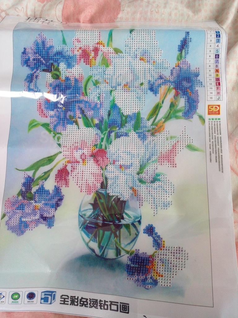 The flowers are beautiful, the rhinestones are bright, everything is included. I really enjoyed it. The only thing is that I do not recommend paid delivery. With free delivery, I received the painting 7 days earlier, the parcels were tracked in the same way, I ordered both paintings from this seller on the same day. They arrived in Ukraine in one day and the paid delivery was suspended. I recommend the seller, there is no point in overpaying for paid delivery.