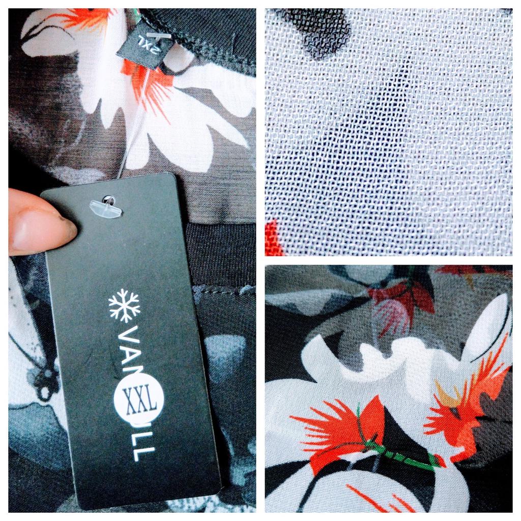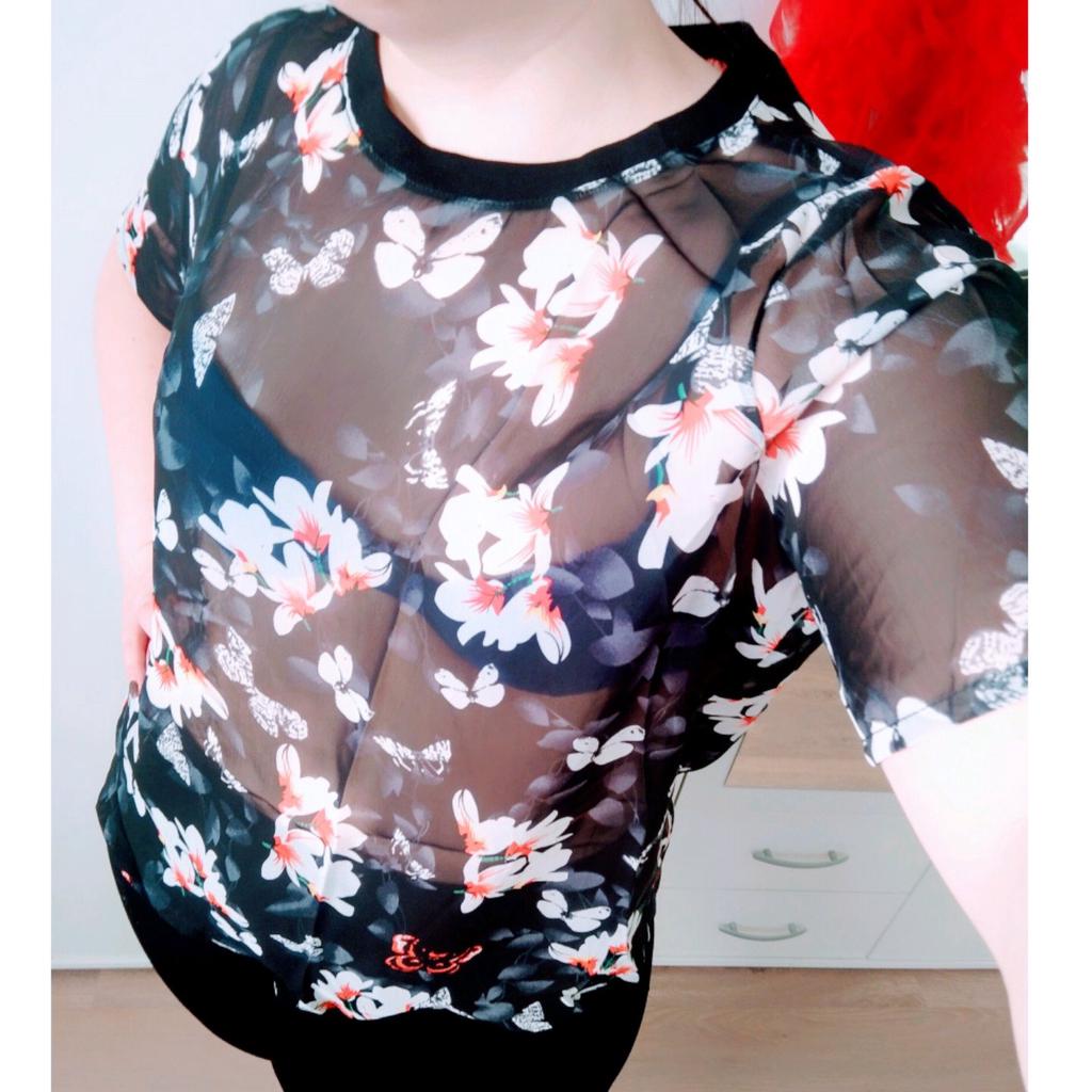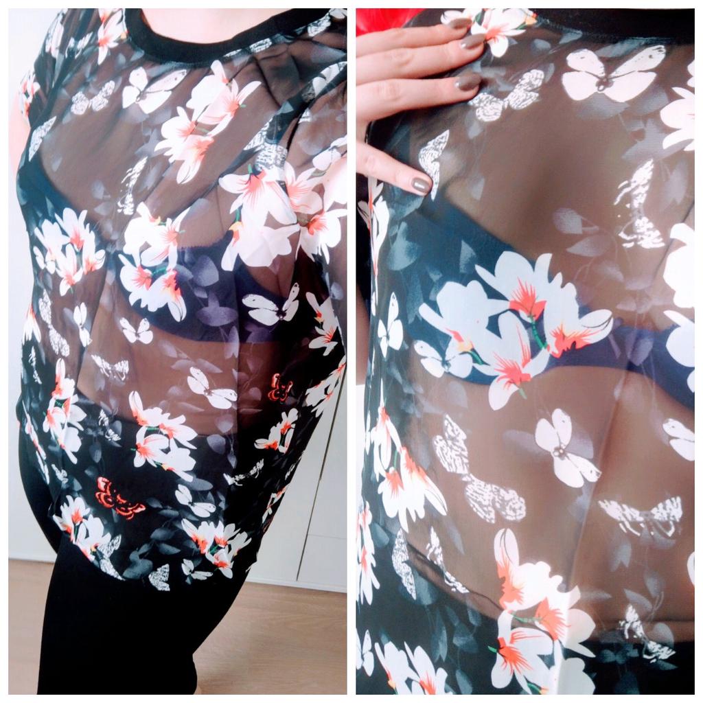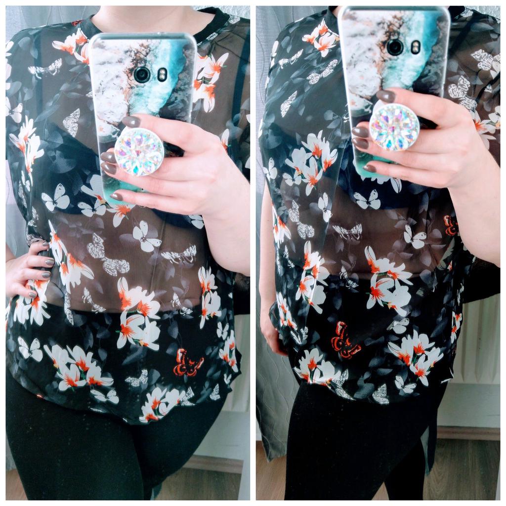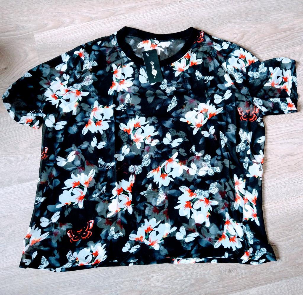 The order was delivered in 14 days as a registered mail and was well packed in a strong plastic envelope. This is a beautiful, black mesh T-shirt from the brand "Vangull", which has a very pretty magnolia and butterfly print. There was also a variant with white poppies to choose from. The material is a black, finely woven mesh fabric, which is inelastic and transparent and is made from a mixture of cotton and polyester. The shirt has a round neckline and is cut wide. The seams are of super high quality and I could not find any defects. I ordered the shirt in size 2XL and it fits perfectly. Here are my measurements for guidance: Height 163 cm Chest circumference 101 cm Size 85cm Hips 114 cm Shoulder width 43 cm All in all, I am extremely satisfied with the product and the seller and would be happy to recommend both. It's a great top that I'll definitely be wearing more often next summer.