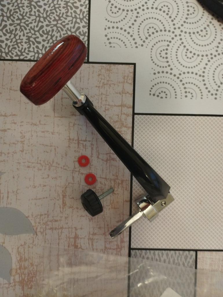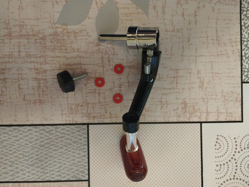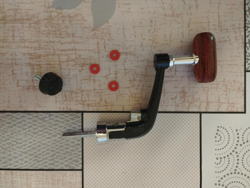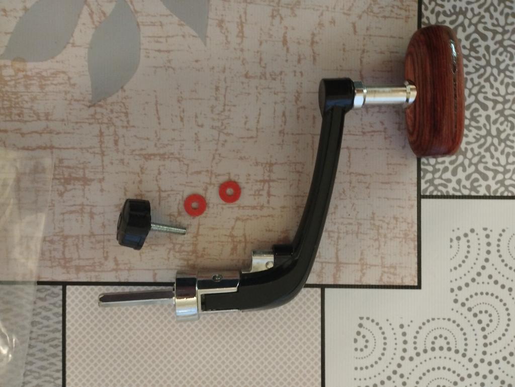 Handle for reel, folds by pressing a key on it Corresponds to the description. I recommend.