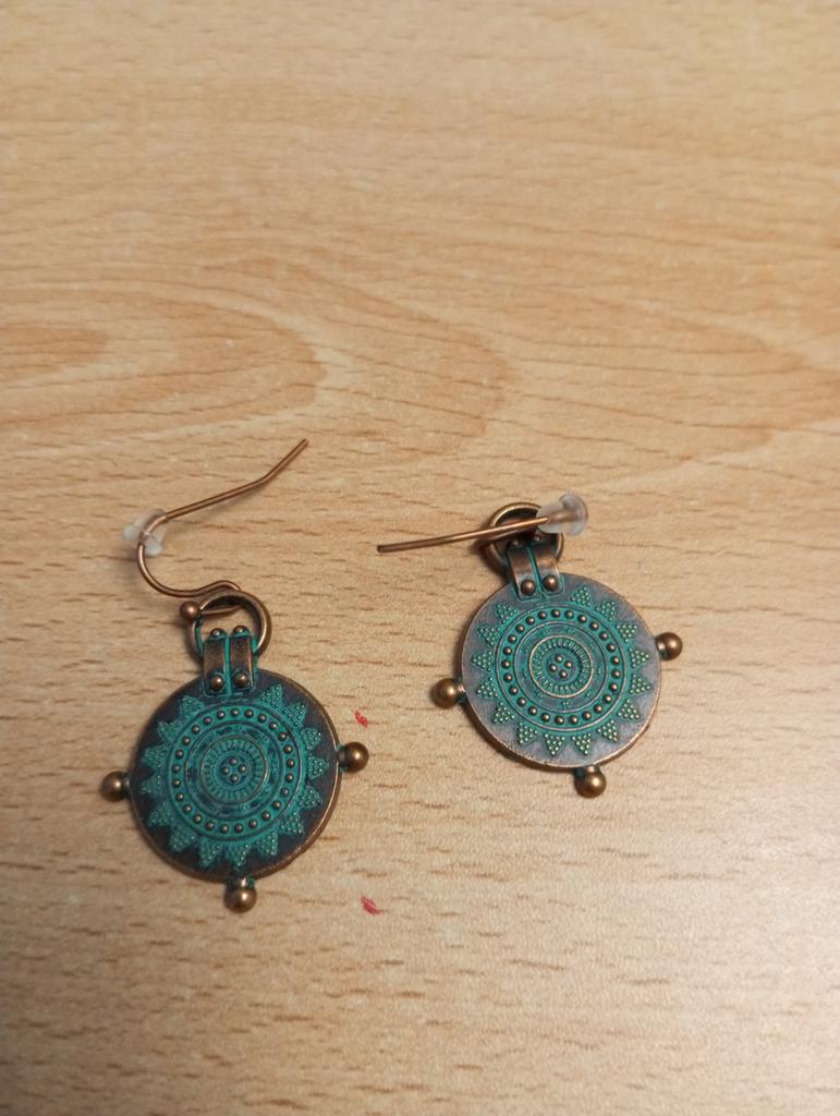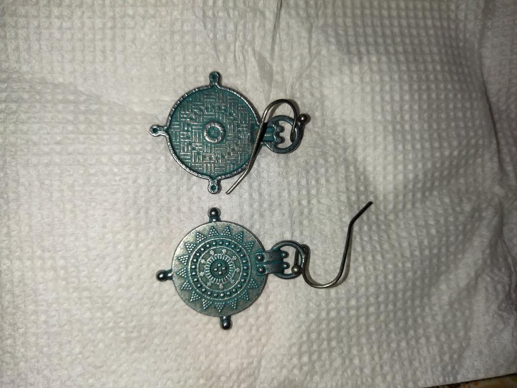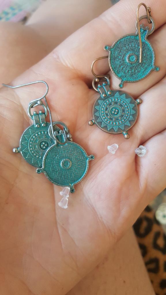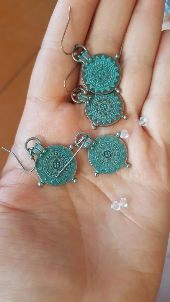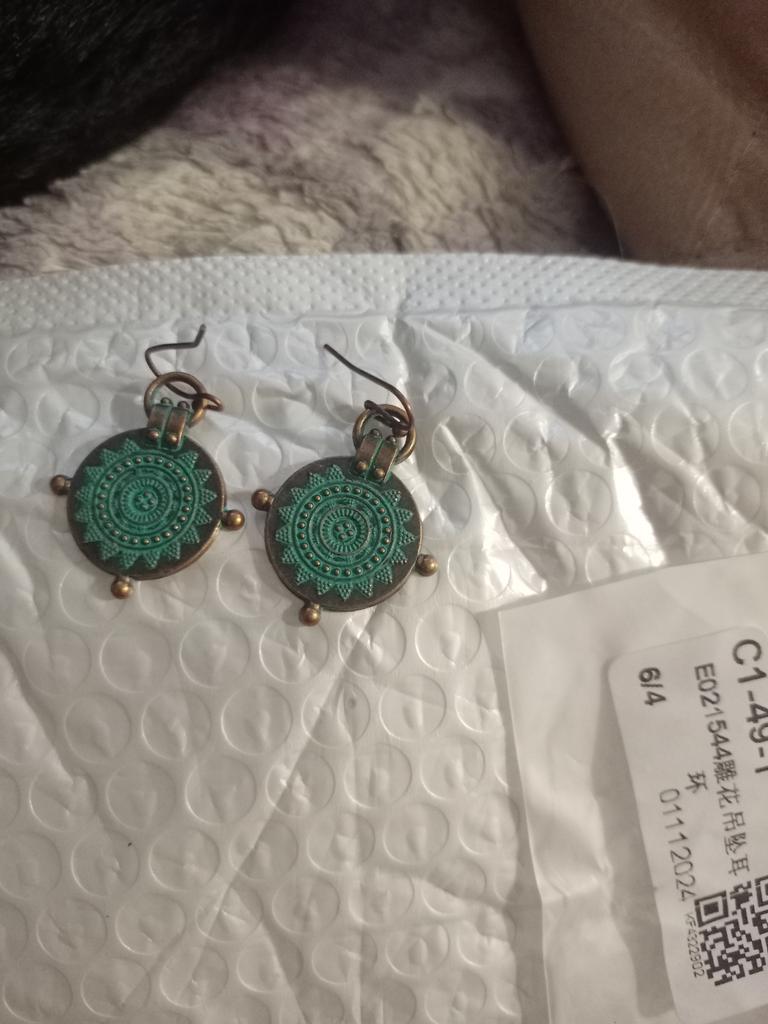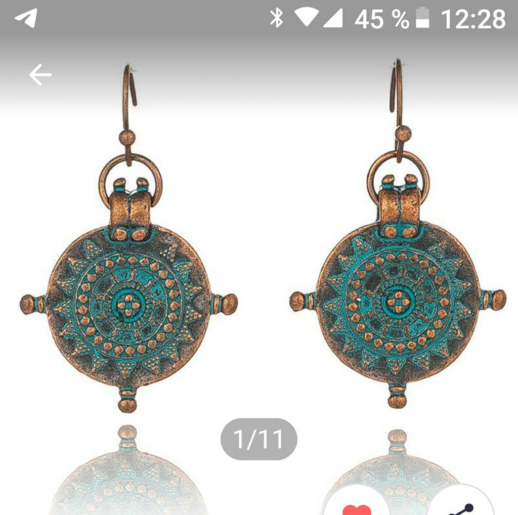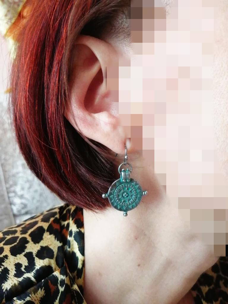 While I was enjoying my vacation at the post office, parcels were already waiting for me. 🎁 Charming earrings in ethno style.☄ Perfectly executed: good detail and drawing on both sides. 🌟 When you look at them, you get the impression that they were made by a master in ancient times. 🌾 The seller has two options for metal, I chose bronze. 😊 The set also includes silicone limiters (caps). When unpacking, be careful not to lose, because they are small. 😉 Before writing a review I wore it for 8 hours. The metal did not cause irritation and did not leave green marks on the skin🌟. Everything is fine. 😊 Who loves such jewelry - I recommend. And the seller was pleased, packed everything carefully in an air-bubble envelope. 😊 The track was tracked and sms про was announced on arrival at the delivery point. This is also a big + .😊 If the review was helpful, please 💙