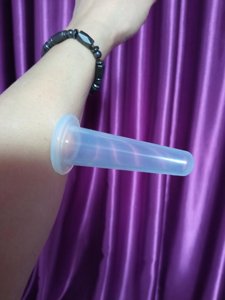 Silicone cups, not small, they stick to the skin. I haven't tried using them yet - the massage won't work without oil. Thank you.