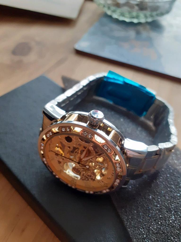 Spectacular watch, heavy, chunky and just can't wait for my son to open it on Christmas Day! It has a pull out wheel for setting the time and when closed wind it up to watch the clock work inside and out. White Gold. So pleased. Thank you Joom!