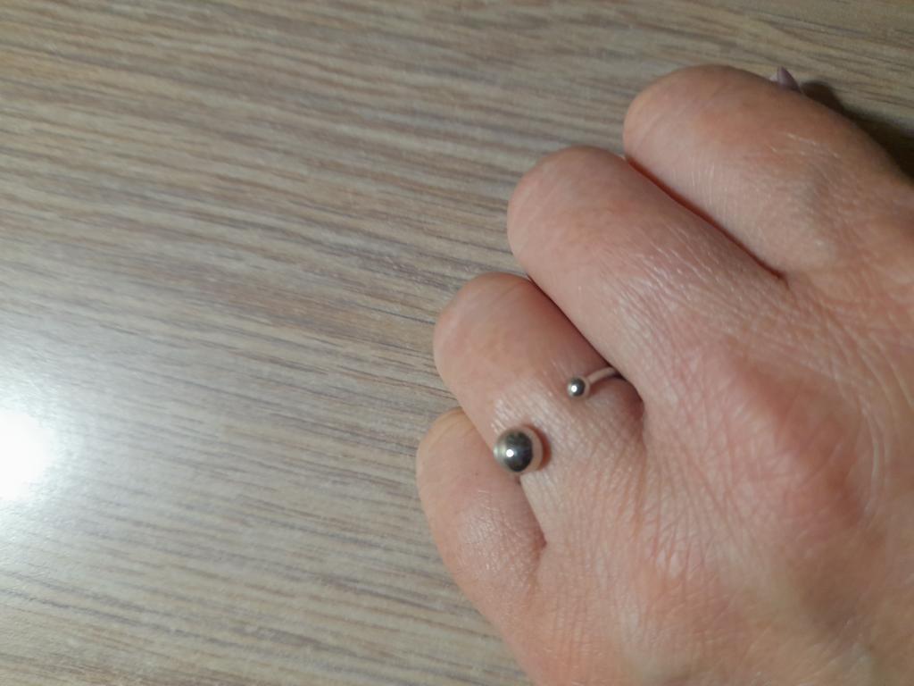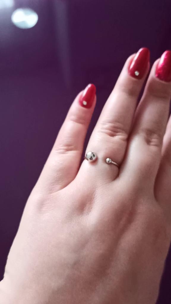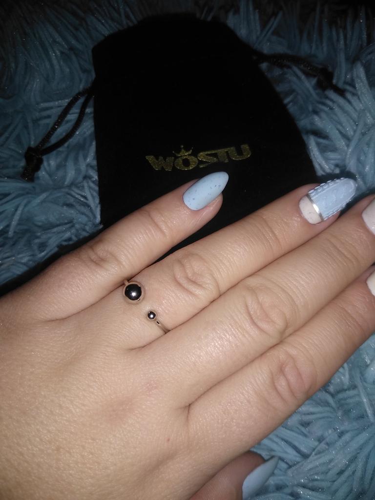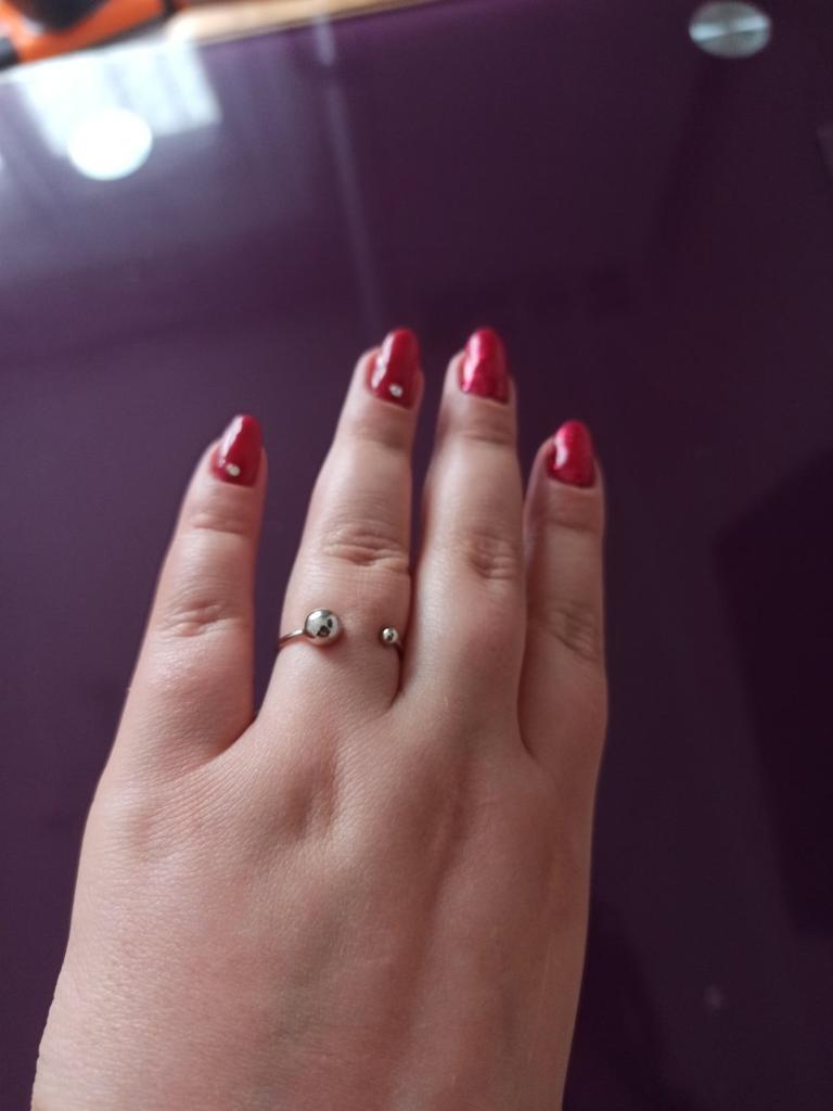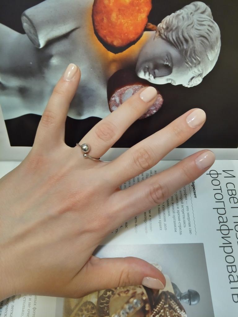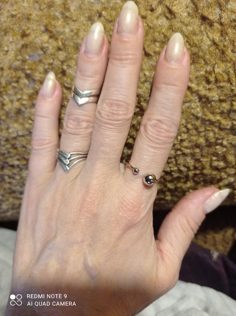 Silver ring with flexible size 🍉 Minimalist and delicate decoration. The S925 sample is engraved on the inside (this is the standard marking for sterling silver products in China). The metal is soft, easily acquires the desired shape. There is rhodium coating. Quick delivery. In general, I like the ring, I've been wearing it for two weeks and I don't take it off 😊 At first I wore it on my index finger because I wanted the gap between the balls to be noticeable. During operation, it was determined that this is not for me, because I constantly cling to my hair or clothes with these logs. ⚠️ I think for fingers larger than 17.5 rings will not look good, will be small and very stretched.