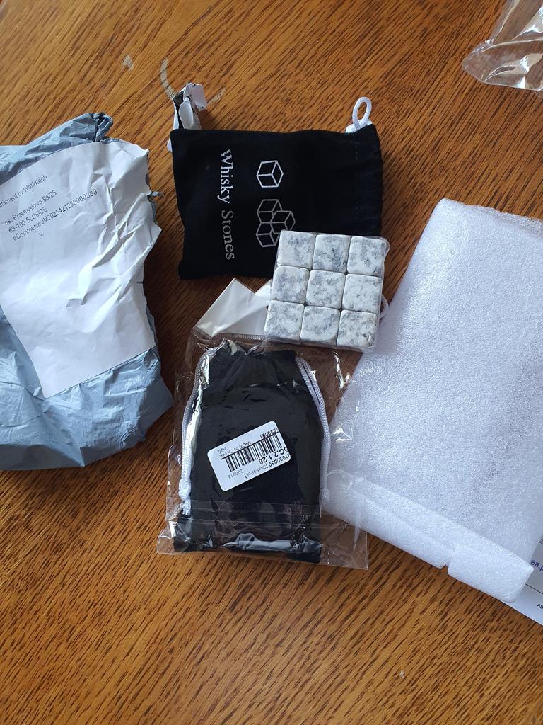 Fast delivery, item and application as described. For comparison, the 3 stones in the middle row were used previously and are slightly darker when wet than the dry stones; this is reflected in drying off. Three stones with the same level of liquid as the stones are required for lasting cooling. When using a long drink glass, a whole bag with 9 stones is necessary. This is still fine for one person alone, but rather unsuitable for use at a party, since the stones also need a prior cooling time of 4 hours. Very easy to clean and so far no staining from fruit juices.