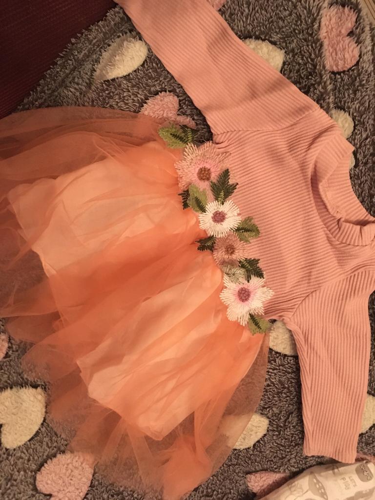 It came quickly The dress is beautiful, as in the photo The top is warm, stretches Bottom lining (thin) and 1 layer of fatin Satisfied with the product