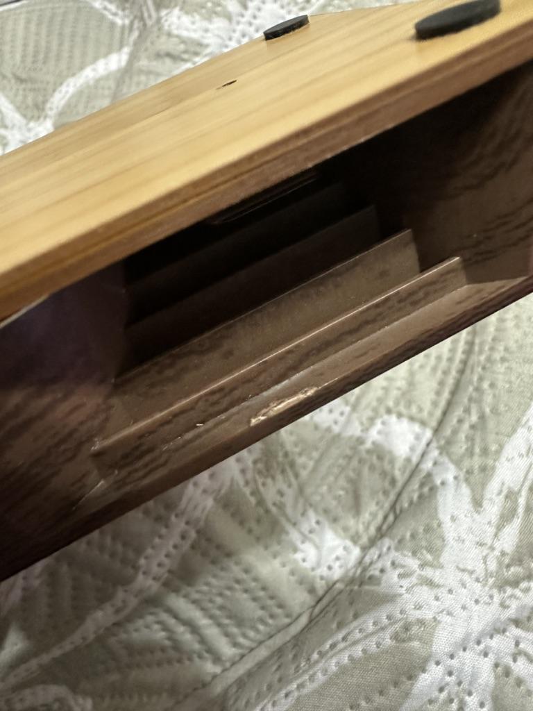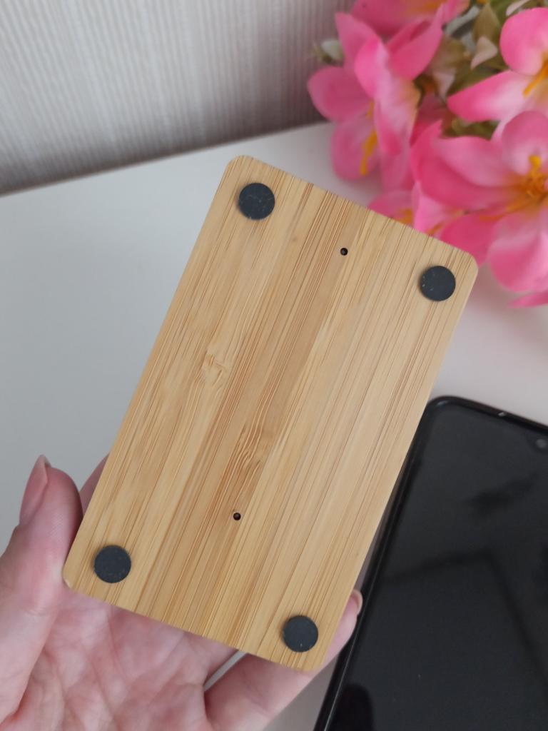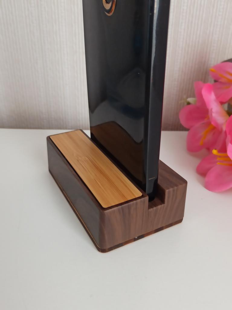 Material: bamboo and plastic with wood pattern. In a vertical position, the phone sticks out almost without tilting --- the position is unstable. I don't feel any increase in sound.