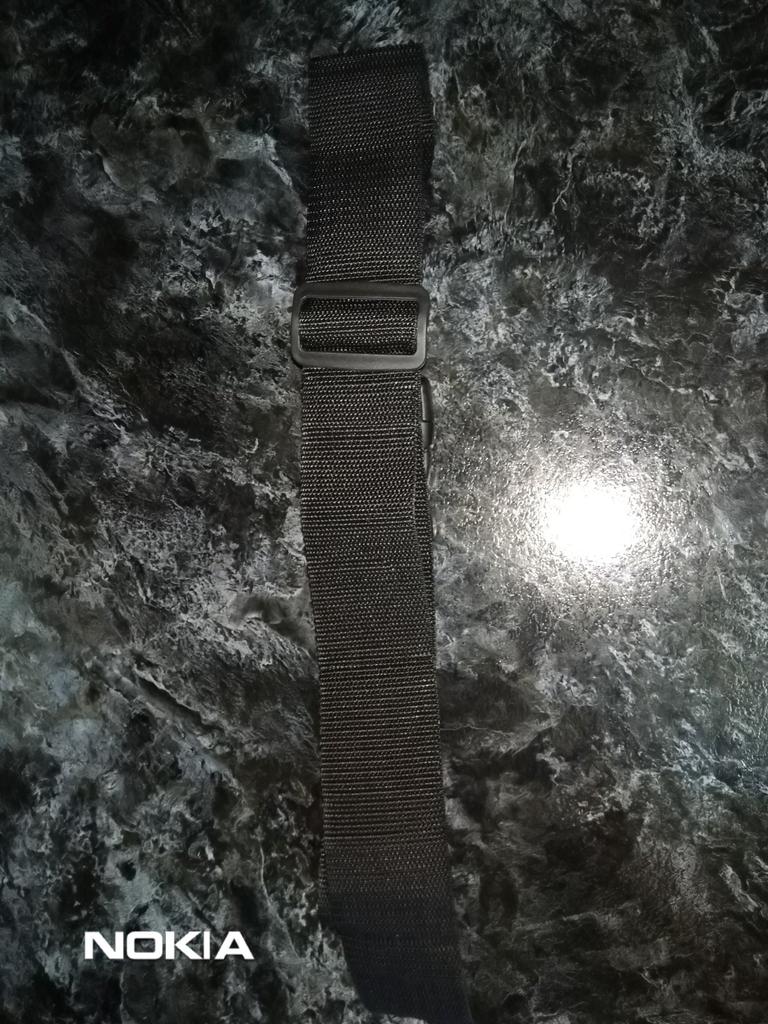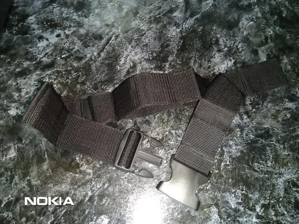 Plastic buckle as expected and long fabric waistband. In terms of quality, however, impeccable