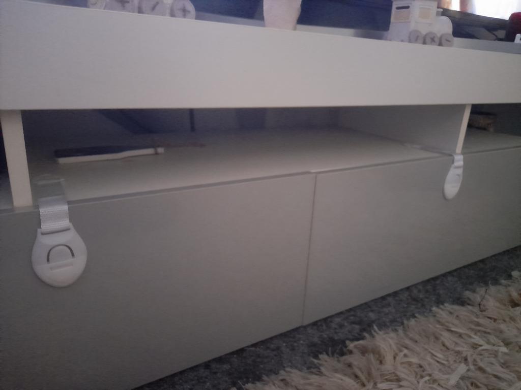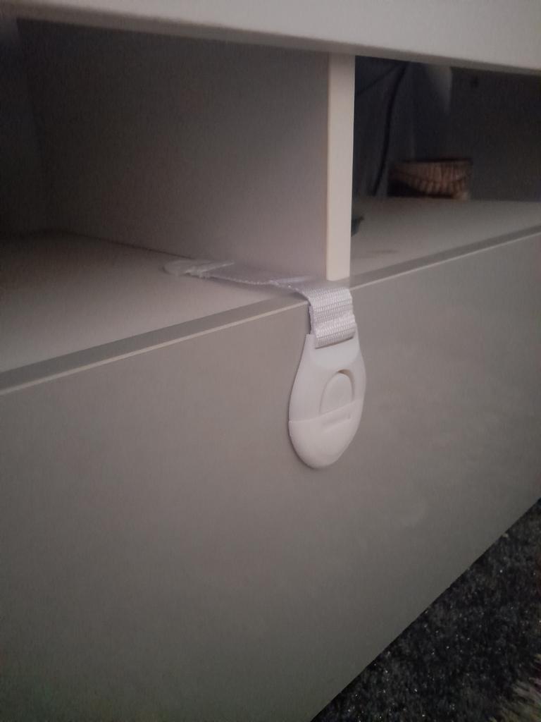 So far he hasn't worked it out, thank you so much they were a perfect idea the kitchen one he doesn't go in anyway. But we have to of course cleaning products are in there as well as dog food.