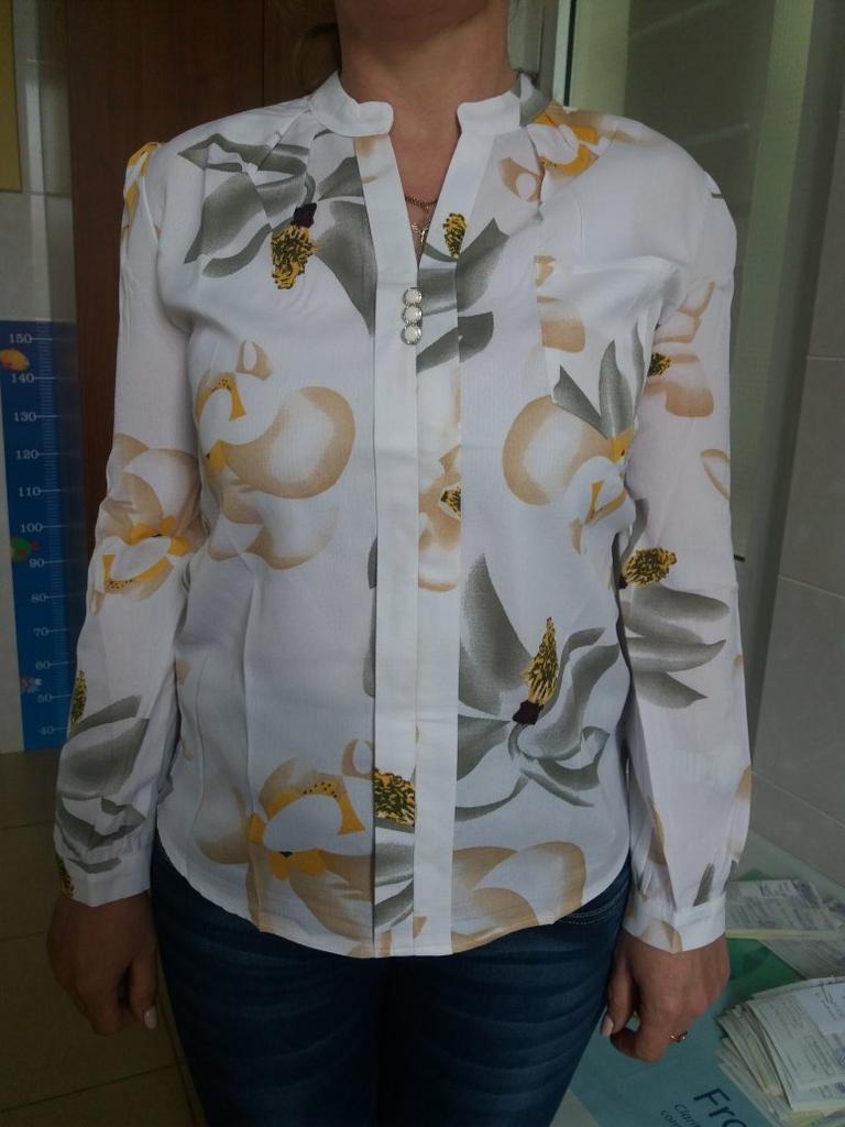 The blouse is very beautiful, sewn professionally, there are no flaws. I ordered a 46 size XL - it was sewn on me. Thanks to the seller!!! As for the office, it is simply incredible, everyone turns around.