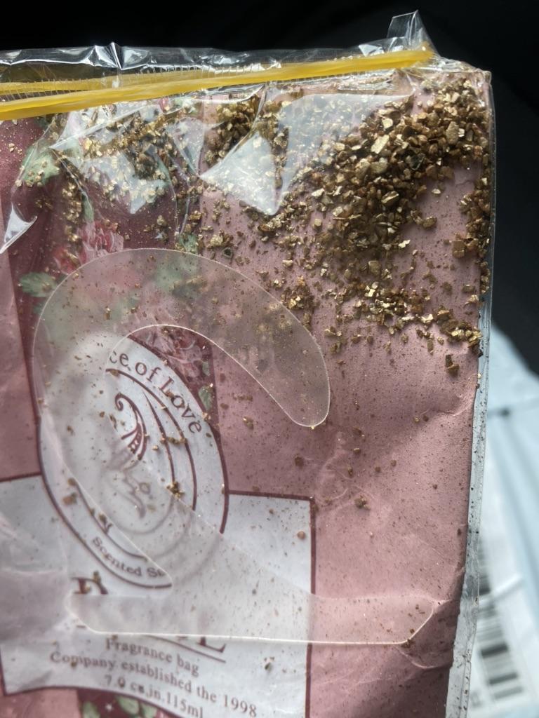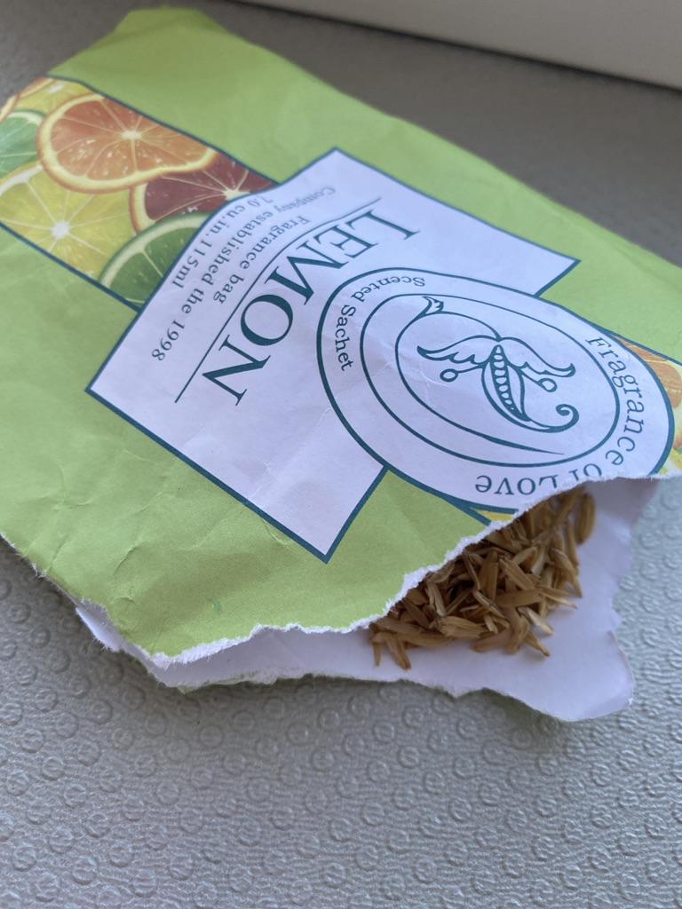 The paper bag contains scented seeds. There is a hook, but how to hang them on it? The smell quickly evaporated.