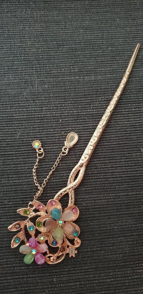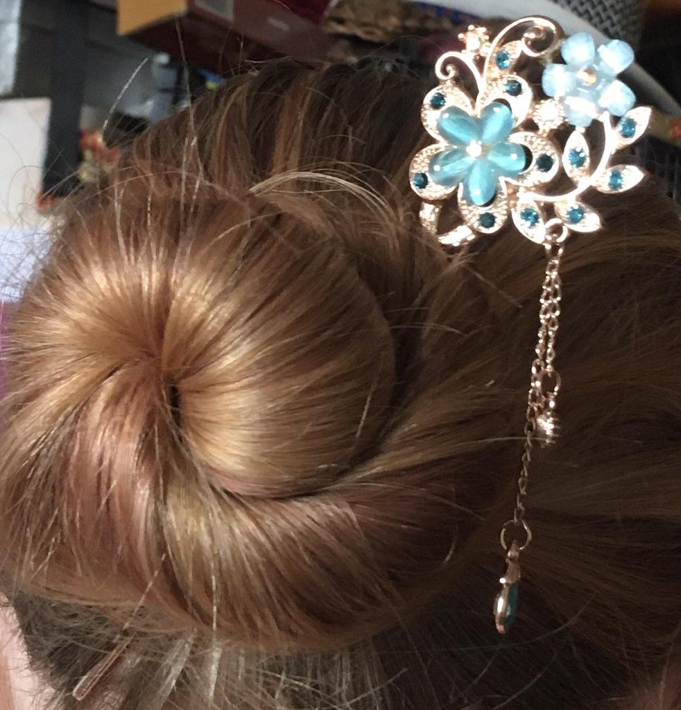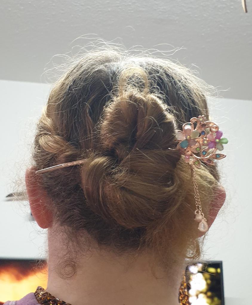 It looks great and I think the stem is very nicely done as a transition into the flower. However, the handle is unfortunately small to make a real hairstyle with it. For a small bun or simply as jewelry in the braid is definitely possible.