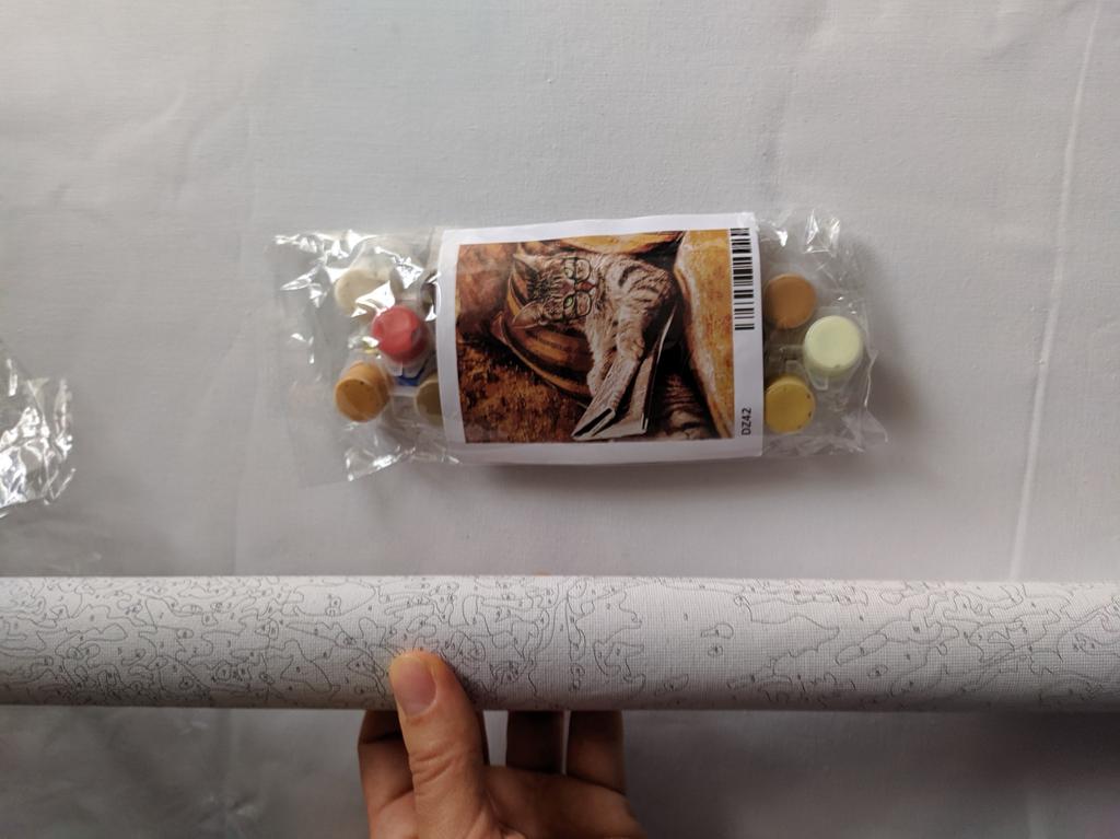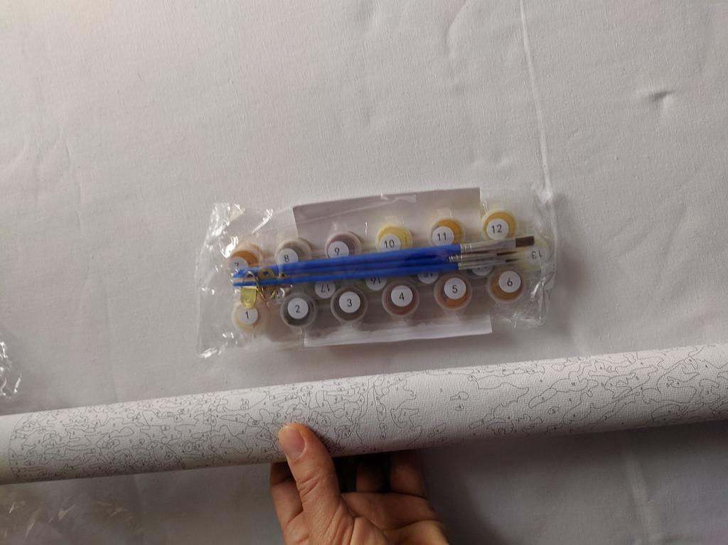 The package comes with the printed canvas and the paints. Everything was there and the colors are sufficient.