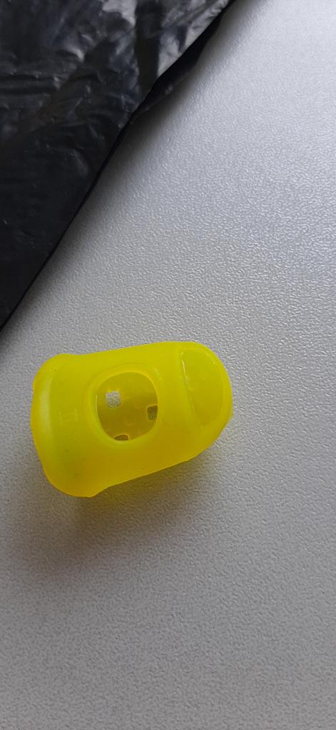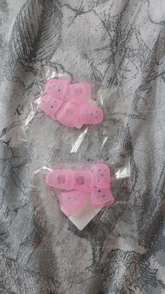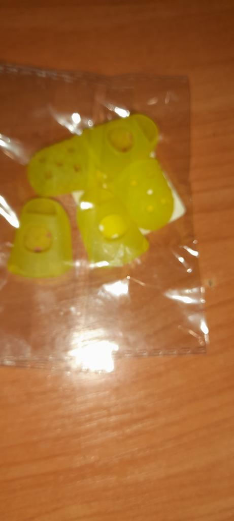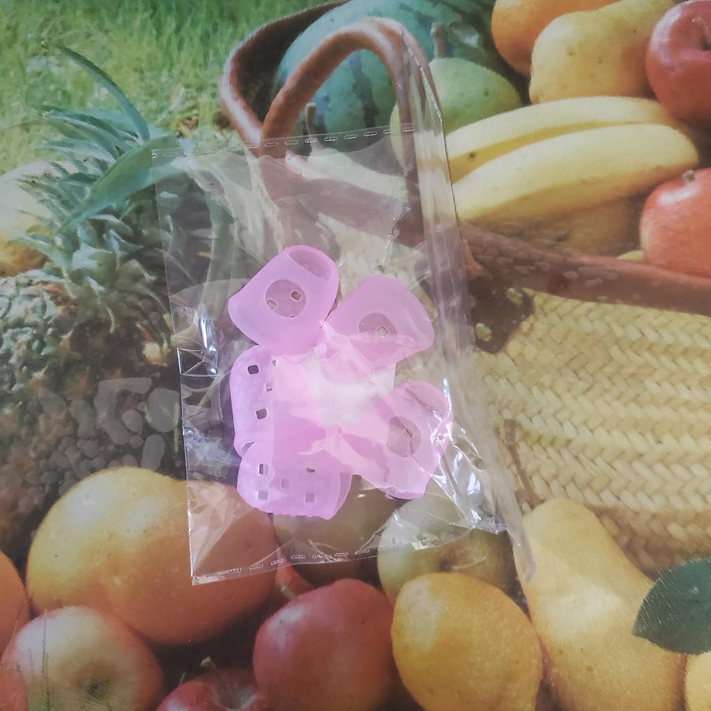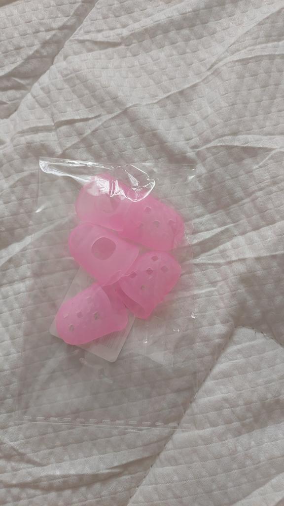 Soft silicone caps. 5 pieces arrived. It's a little tight on my already middle-aged fingers. A funny plus is that a long nail can be inserted into the slot and it will not push against or damage the silicone.