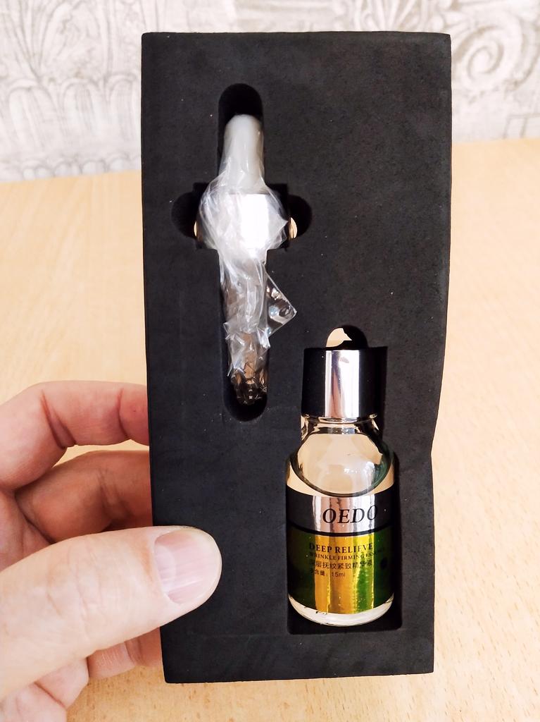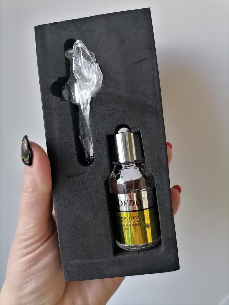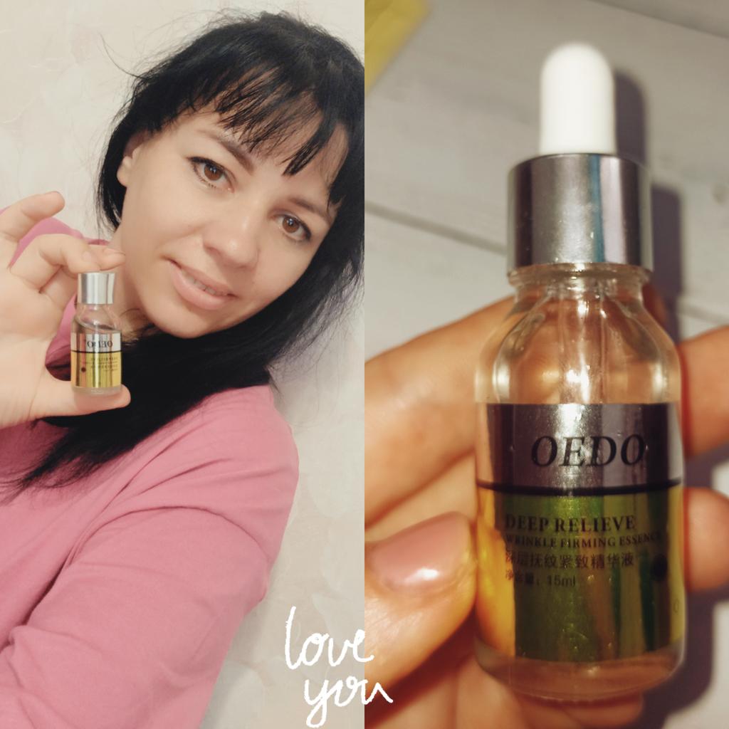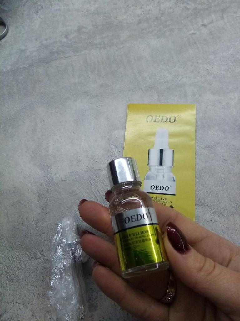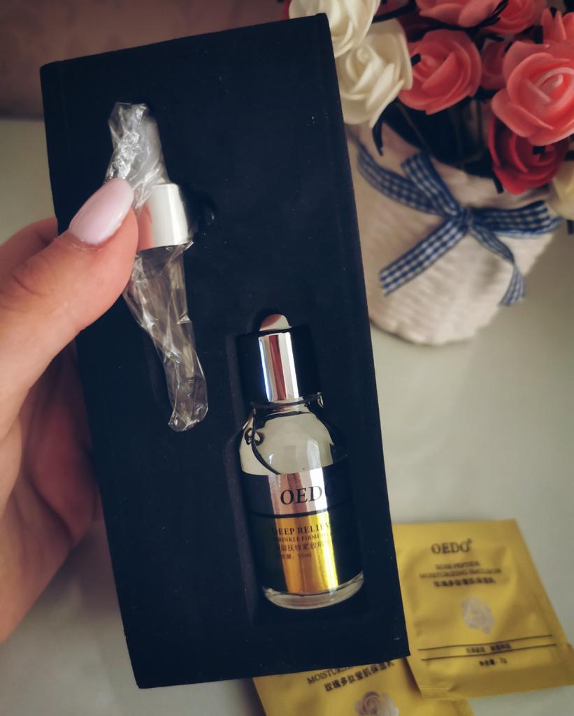 Deep Relieve Wrinkle Firming Essence - brand: OEDO This essence is for: 💮 Anti-aging 💮 Anti-wrinkle 💮 Firming Skin 💮 Moisturizing 💮 Smoothing 💮 Nourishing skin This essence locks water inside the skin. How to use: Warm up the couple of drops between your palms and gently press your palms onto face, eye and neck for 10 seconds then massage untill it's fully absorbed by skin. Net amount is 15 ml. Absorbed by my skin so easily and quickly. It doesn't give greasy feeling. It almost odourless. I love that glass bottle is secured with (black) foam inside it's own package. I recommend it 👍 ✏️ If you buy one after seeing my review, please leave a comment. I would love to know that my review is useful.