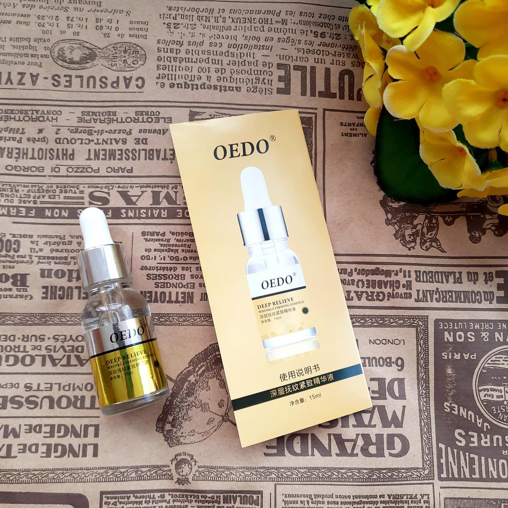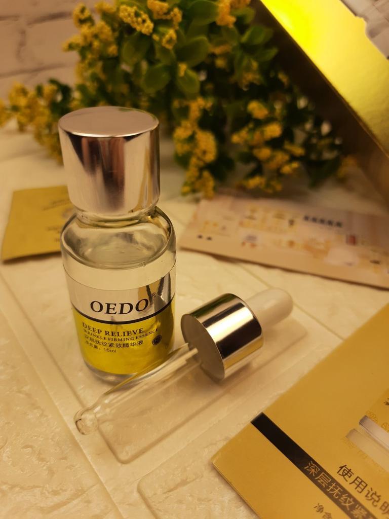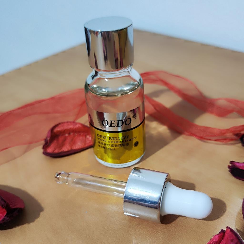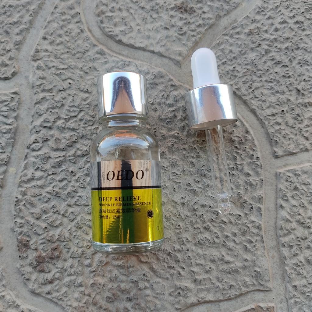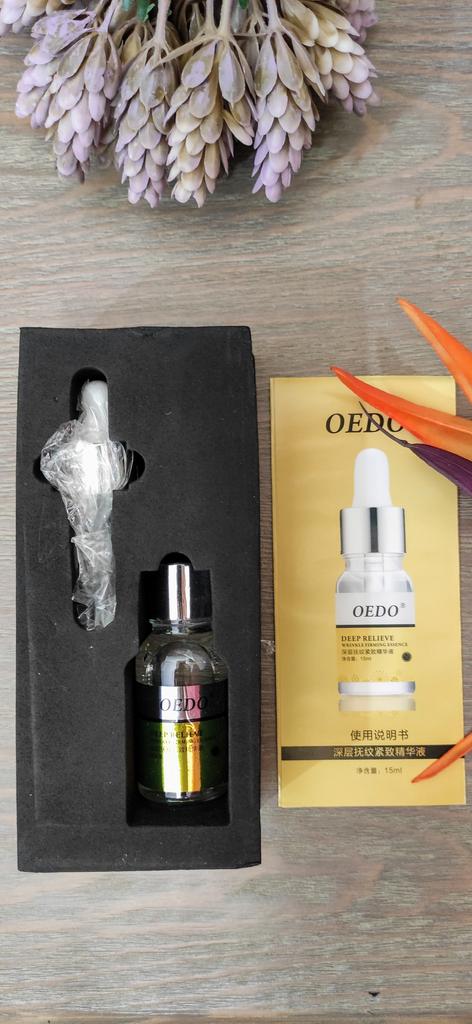 Hi friends 🌹 OEDO Deep relieve wrinkle firming essence. This essence contains amazing hydrating ingredients that lock in the moisture and repair your skin's barrier. This prevents water loss and improves your skin's texture and health. Deep relieve wrinkle firming essence is suitable for all skin types. How to use: Ideally, this would be twice a day and always after cleansing or exfoliating, your skin is still damp, press a few of drops into your face with the fingertips and massage the whole area. Net weight: 15mI Essence is non-sticky, it has no oder and can be absorbed quickly. Would recommend it.Great product.👍🏻