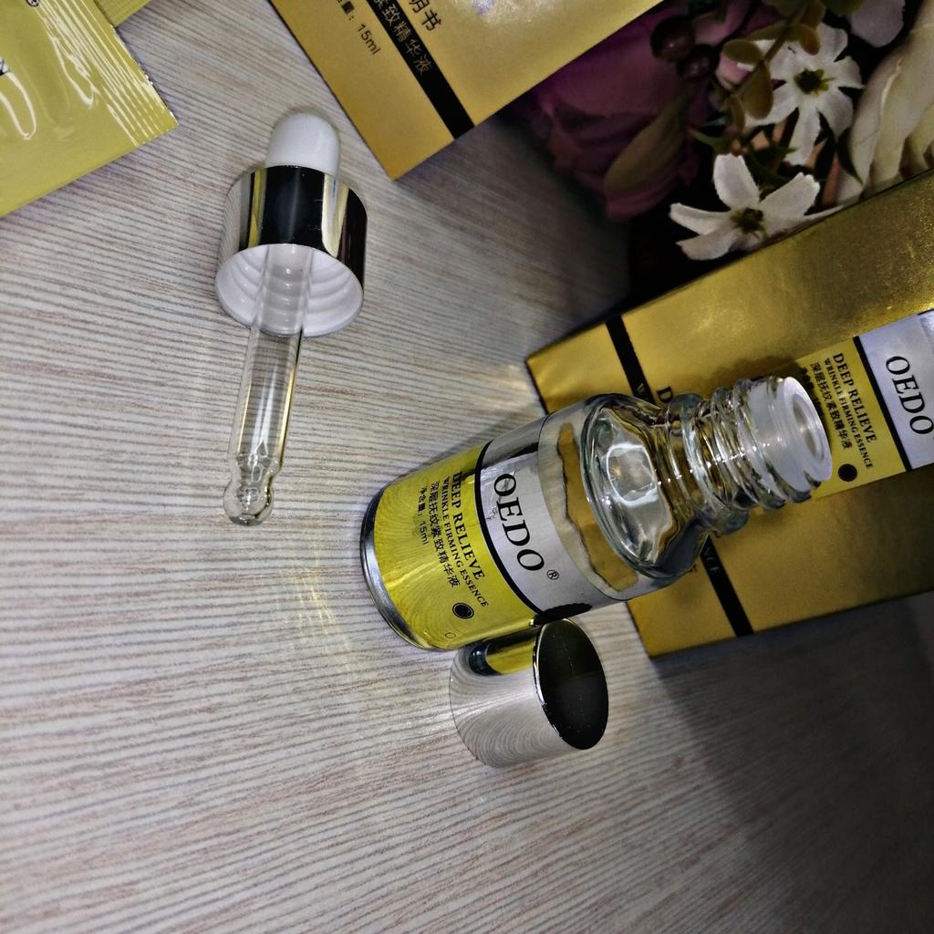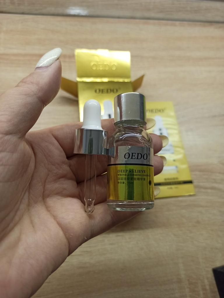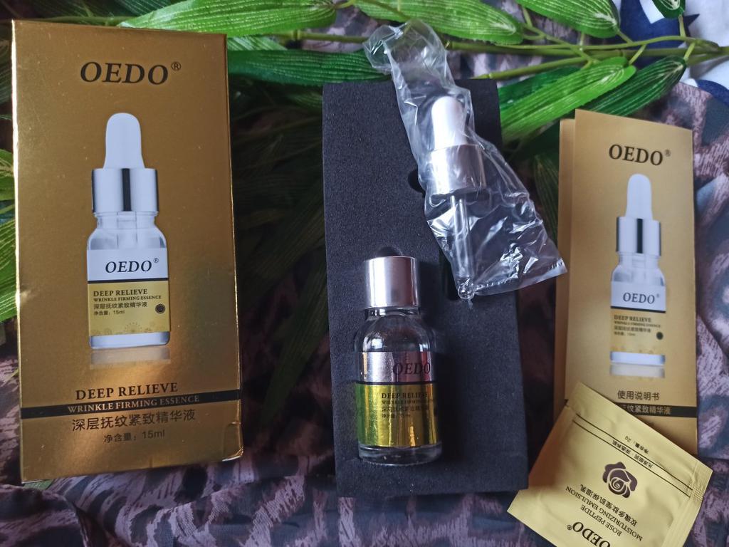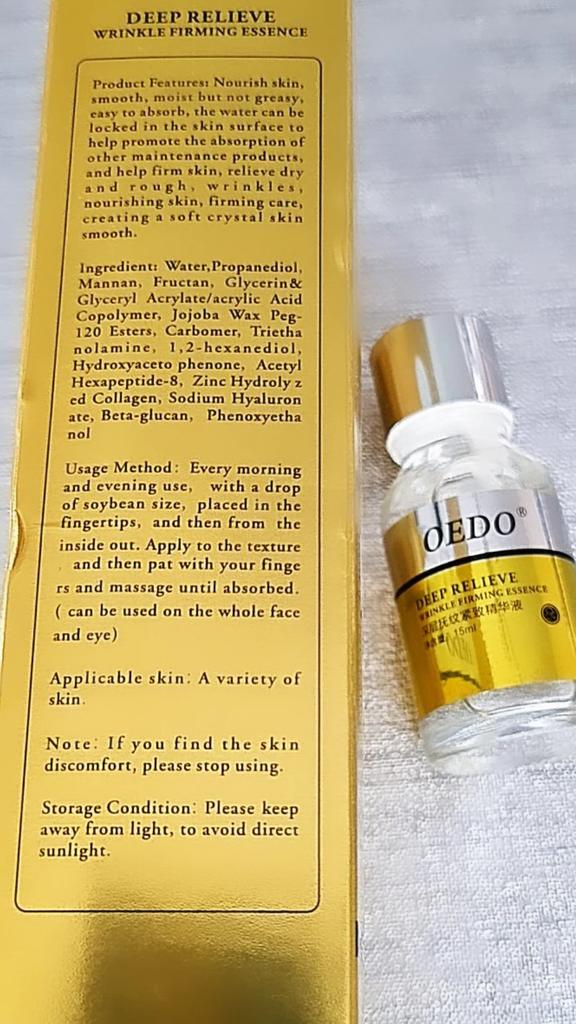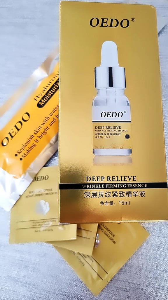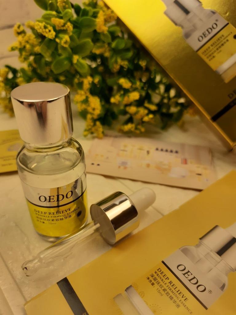 Hi friends 🌹 OEDO Deep relieve wrinkle firming essence. This essence contains amazing hydrating ingredients that lock in the moisture and repair your skin's barrier. This prevents water loss and improves your skin's texture and health. Deep relieve wrinkle firming essence is suitable for all skin types. How to use: Ideally, this would be twice a day and always after cleansing or exfoliating, your skin is still damp, press a few of drops into your face with the fingertips and massage the whole area. Net weight: 15mI Essence is non-sticky, it has no oder and can be absorbed quickly. Would recommend it.Great product.👍🏻