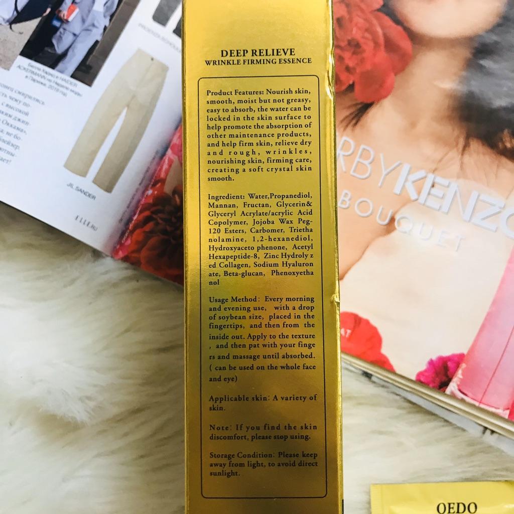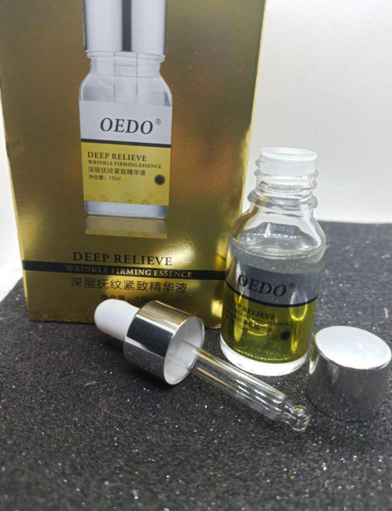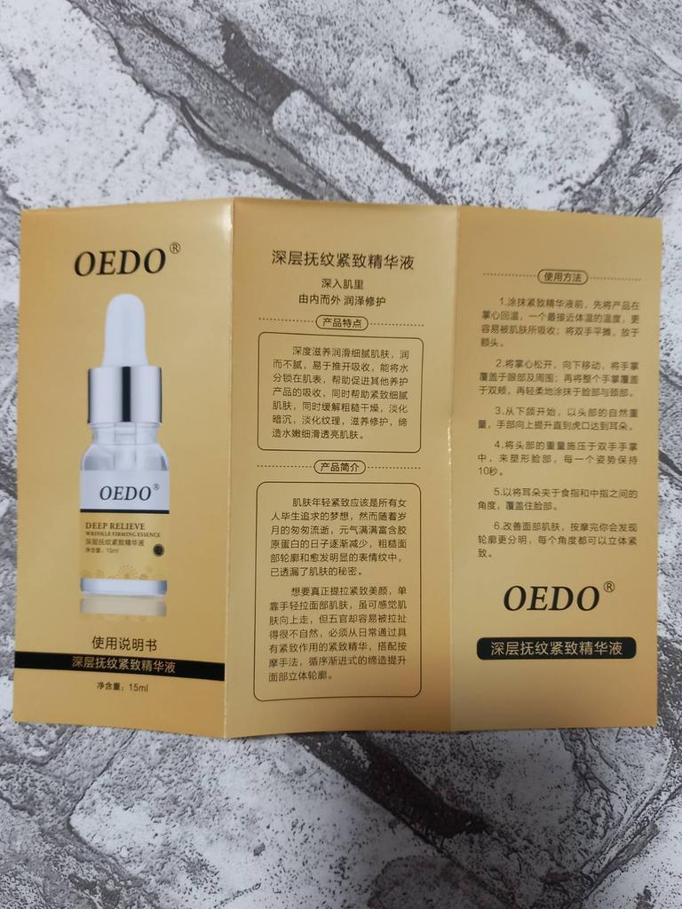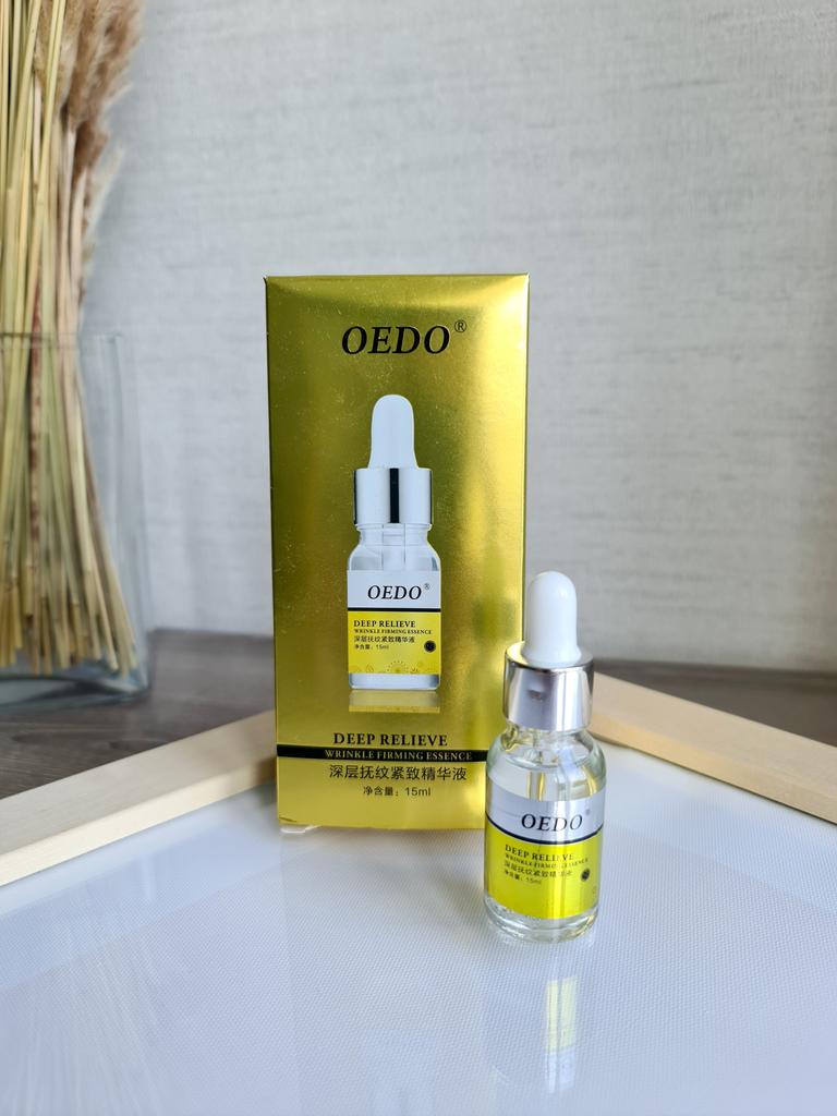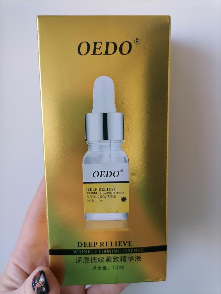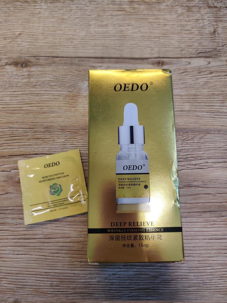 Hi friends 🌹 OEDO Deep relieve wrinkle firming essence. This essence contains amazing hydrating ingredients that lock in the moisture and repair your skin's barrier. This prevents water loss and improves your skin's texture and health. Deep relieve wrinkle firming essence is suitable for all skin types. How to use: Ideally, this would be twice a day and always after cleansing or exfoliating, your skin is still damp, press a few of drops into your face with the fingertips and massage the whole area. Net weight: 15mI Essence is non-sticky, it has no oder and can be absorbed quickly. Would recommend it.Great product.👍🏻