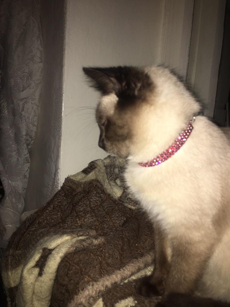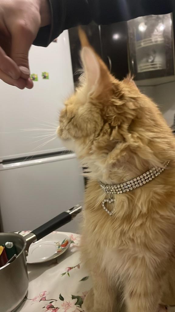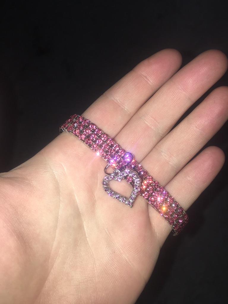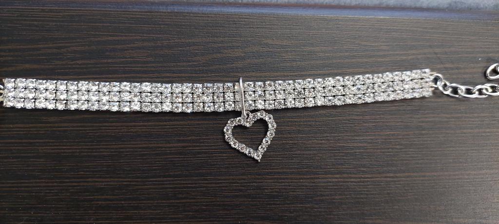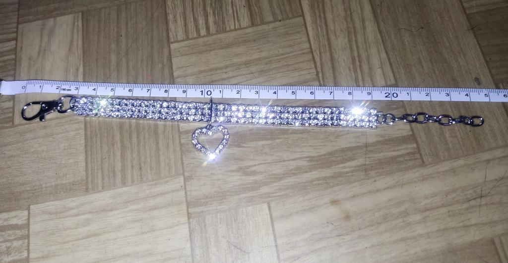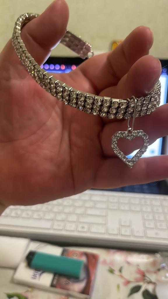 💎💎💎 Pet Collar 💎💎💎 Pet collar with small sparkling crystals 💎 For dogs or cats 💎 The collar is for my youngest house cat. 💎 Perfect for domestic cats or small dogs 💎 The closure works with a hook 💎 The band is made of rubber and stretches 💎 The workmanship is neat, none of the small stones are loose or have already fallen out 💎 The heart is pretty, but you can also easily remove it For my cat (2 years old and about 3kg) I took size S and it fits perfectly. I am very satisfied with the product and would happily recommend it 💎 LG Meli 💎