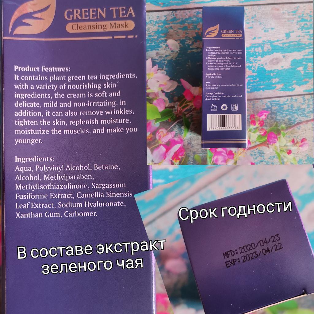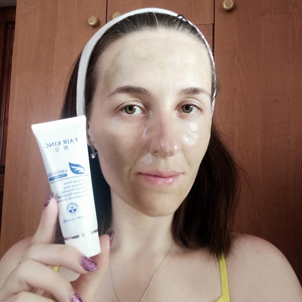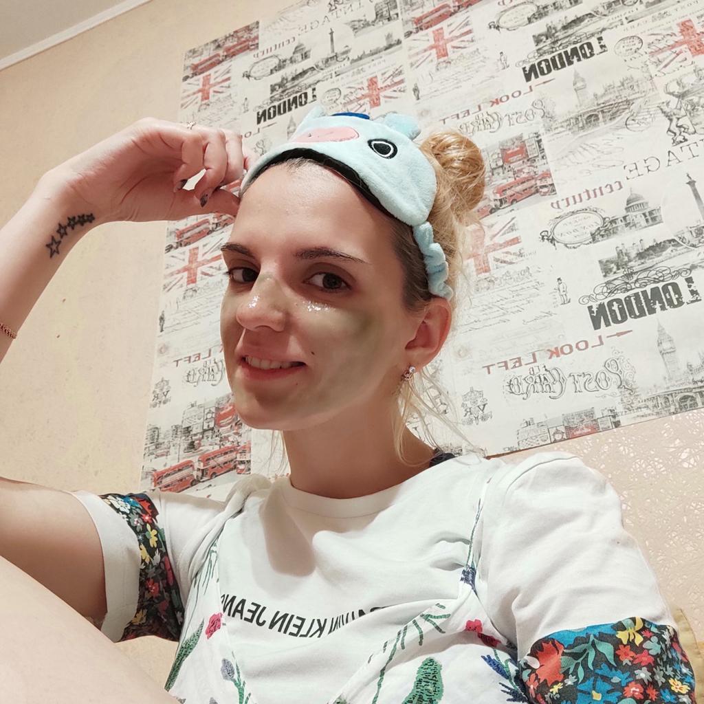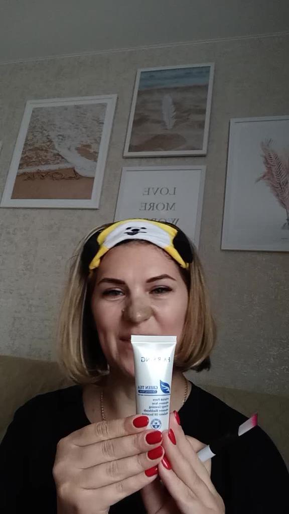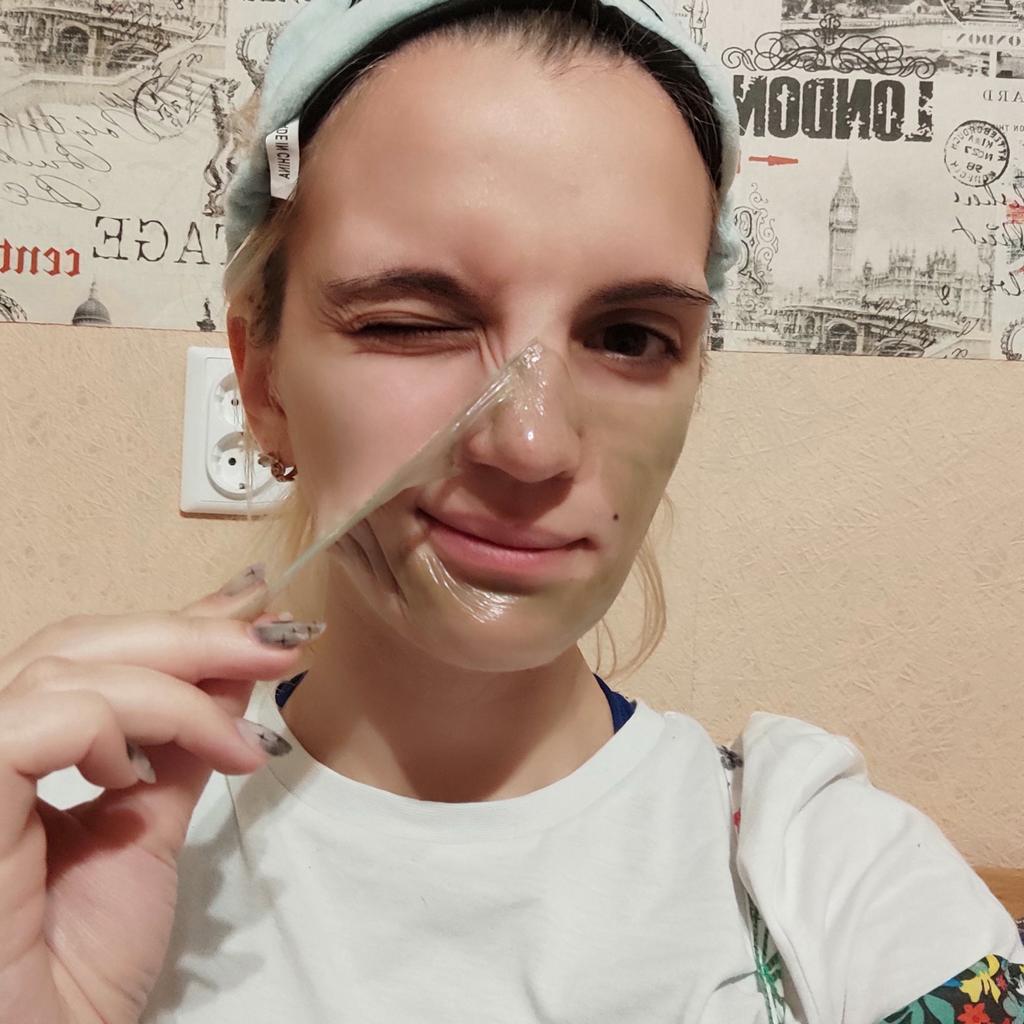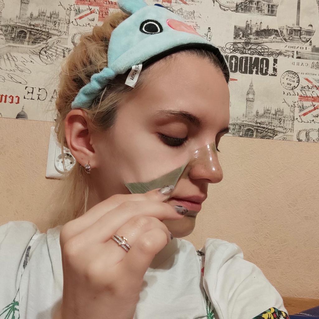 Mask-film for the face with green tea extract🍵🍃 The composition is quite good (see photo) What the manufacturer promises: ▫️Narrows pores ▫️ Removes acne ▫️ Deeply cleanses ▫️ Removes black spots ▫️ Regulates self-discharge What I managed to see clearly after only two uses: ✔️ Visibly narrows pores, but not for long, the effect lasts for several hours. ✔️ Coincidence or not, small pimples dry up the next day and disappear quickly. ✔️ Even the ones I didn't know about were pulled out 🗿 The first test application was done four days after professional facial cleansing, but the mask still found something good to pull out of the pores (see photo) 🍵🍃 I am satisfied with the purchase, I recommend the product and the seller. Patches were put under the eyes as a gift, thank you!
