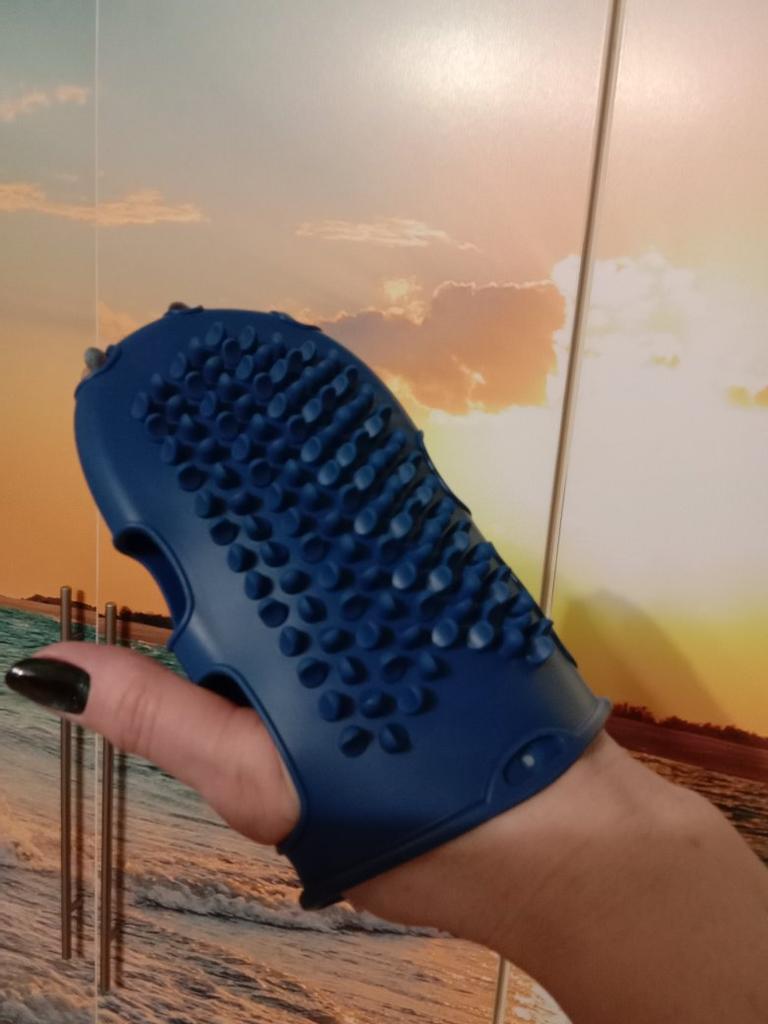 Well, I really liked it. It will not fit on a large man's hand. I'm buying gloves M - this massage one is just right.. No reserve. Silicon. Bends well and is quite tight. The massage of the collarbone area went well. The effect is noticeable.
