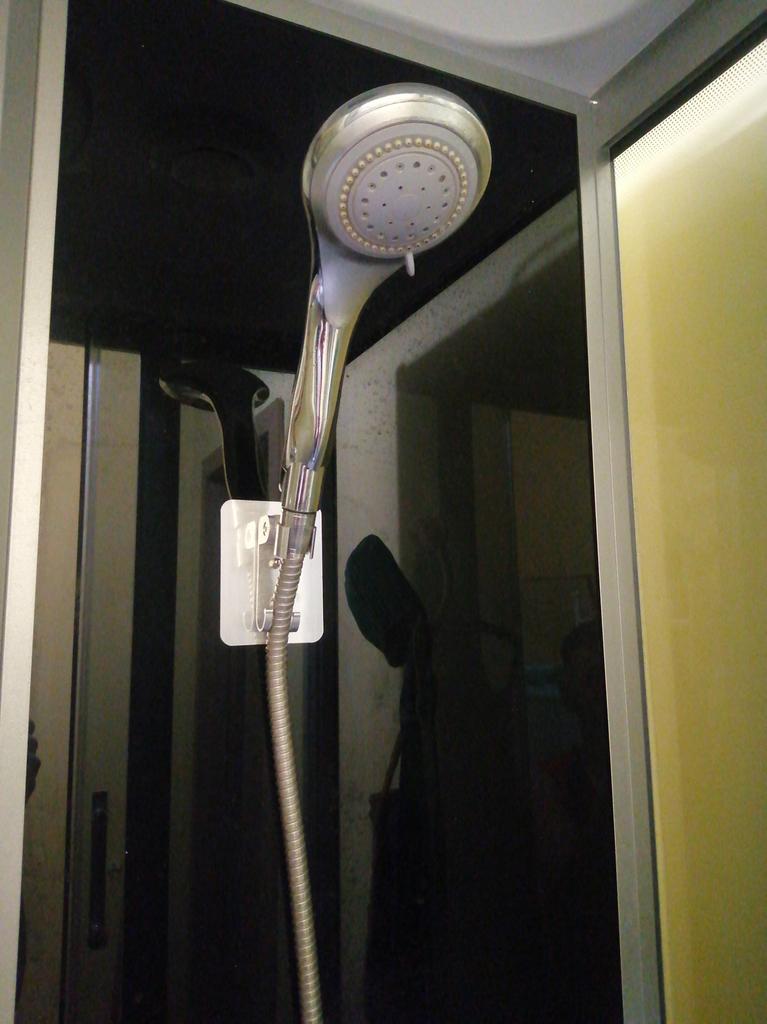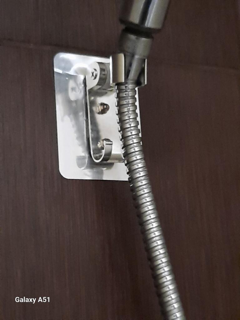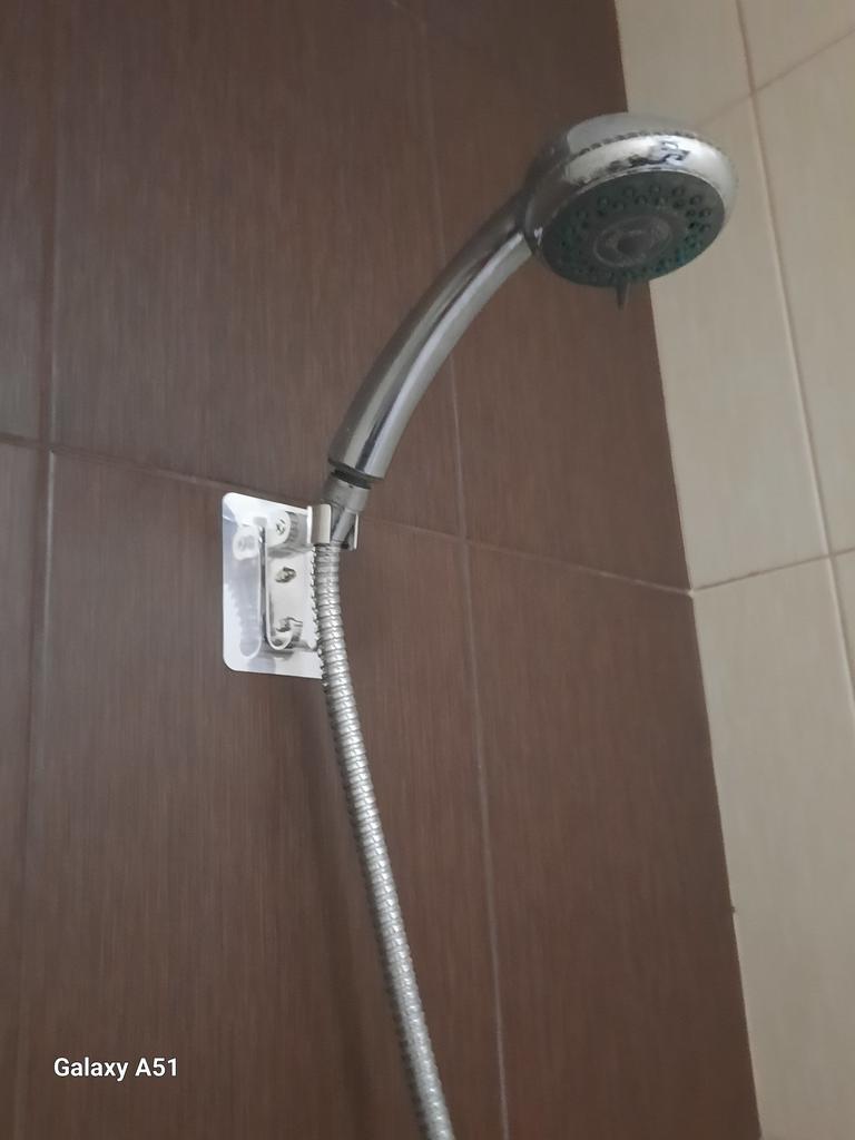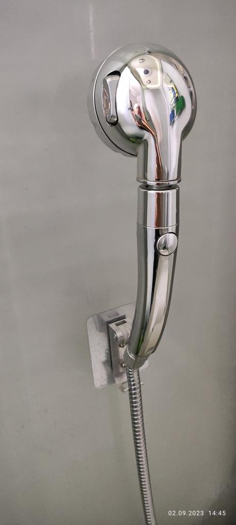 The shower head is finally holding up again, the workmanship looks valuable. The bracket is attached with an adhesive strip.