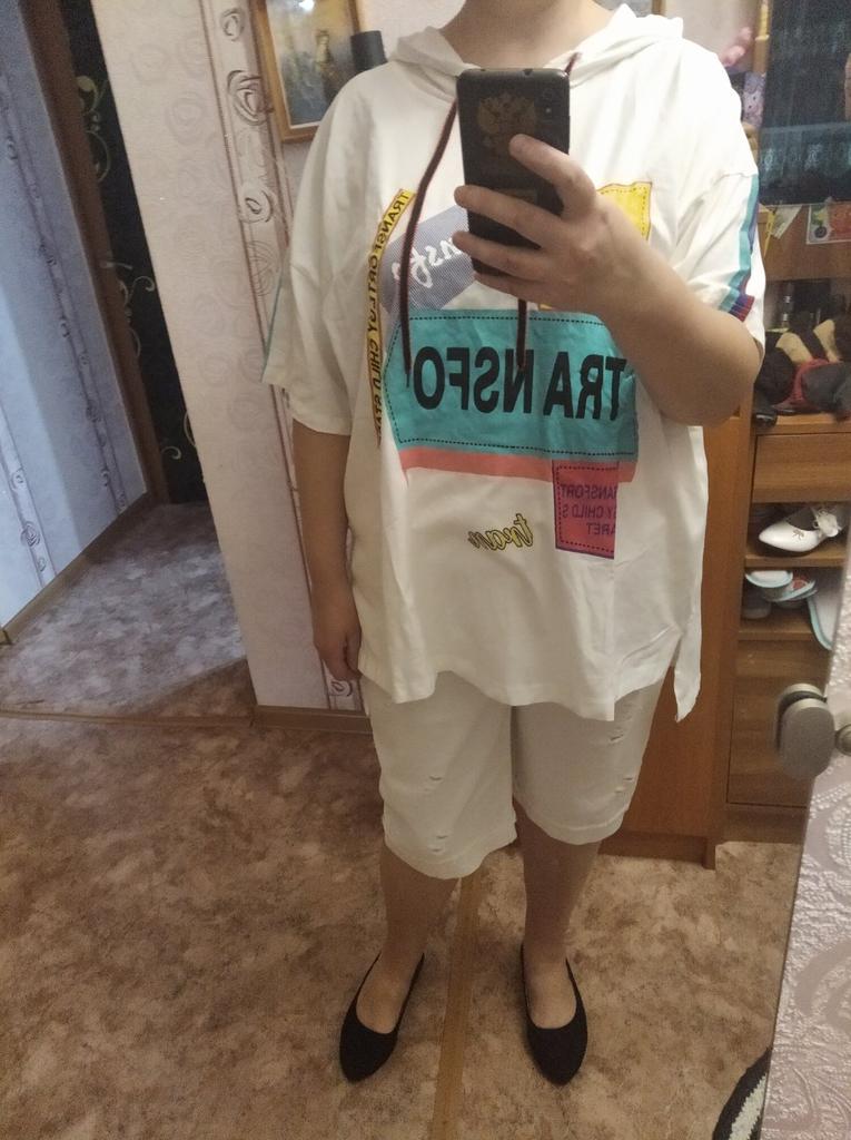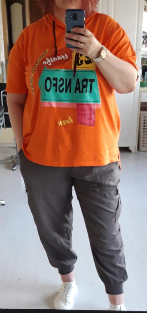 The T-shirt is gorgeous, this is already the second one, I also ordered an orange one. For those who play sports, it’s generally shiny, and you can wear it like that. I recommend it for purchase, especially for curvy ladies, everything unnecessary is hidden!