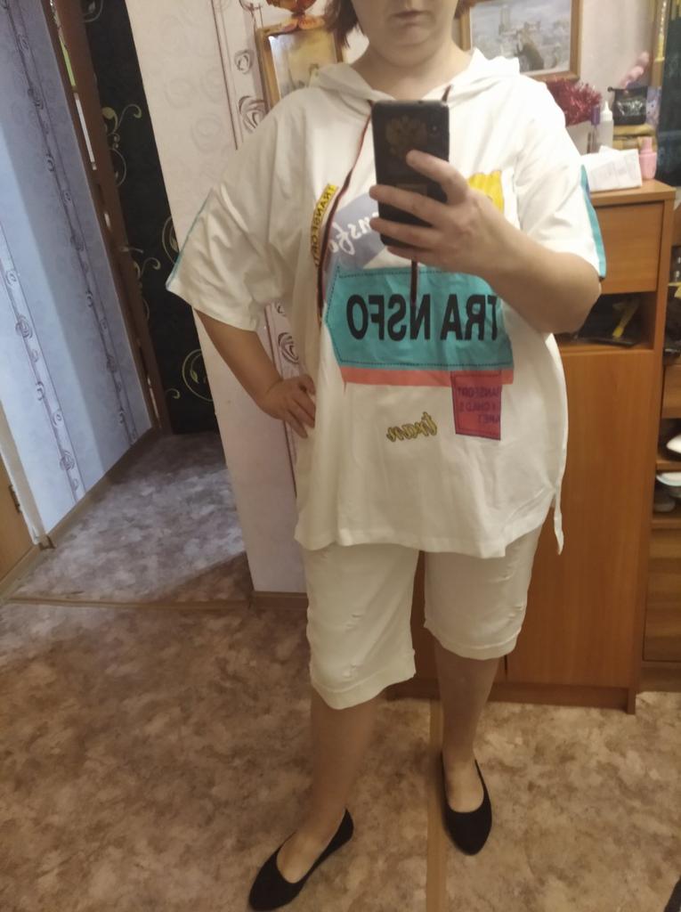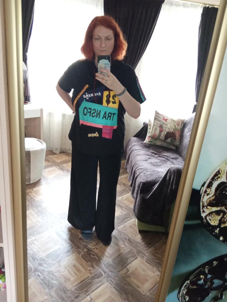 The T-shirt is great. There is no fat showing anywhere, the knitwear is very soft. I recommend it to women with a body. It goes with jeans, leggings, everything.