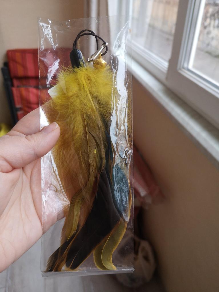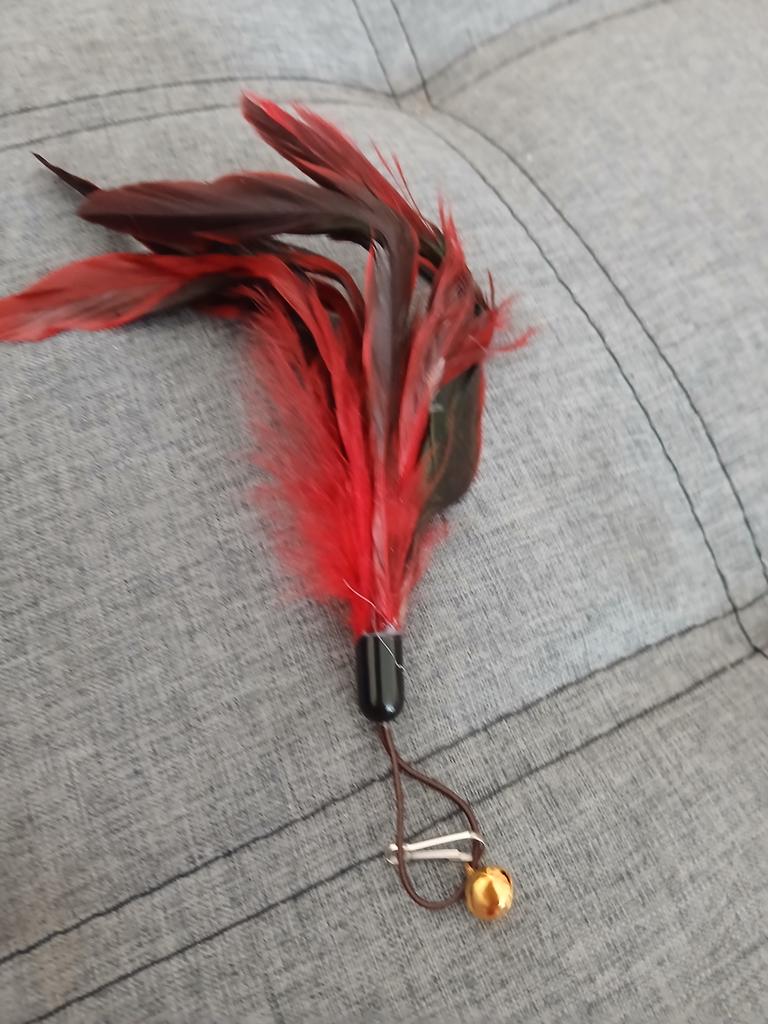 I ordered 2 pieces. The feather toys are large, very bright, with a bell. The cat is delighted. But it’s a pity there are no carabiners to attach, I had to remove them from the old toy🤨