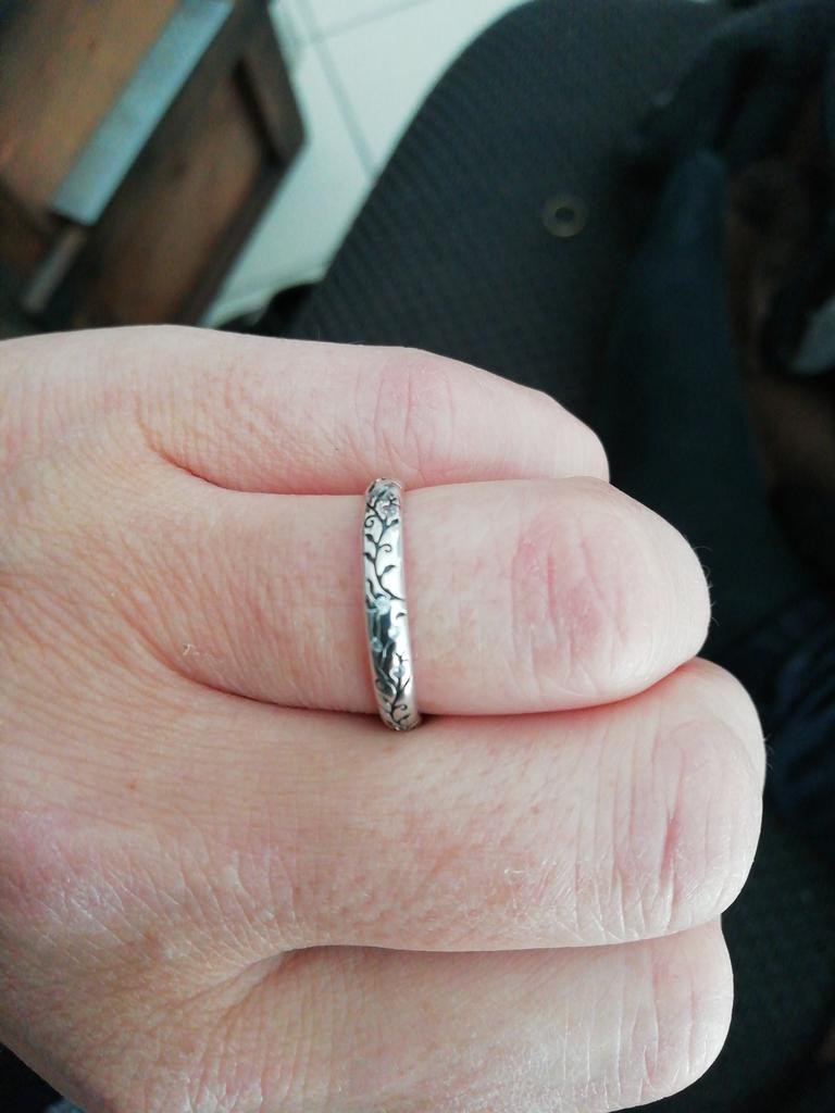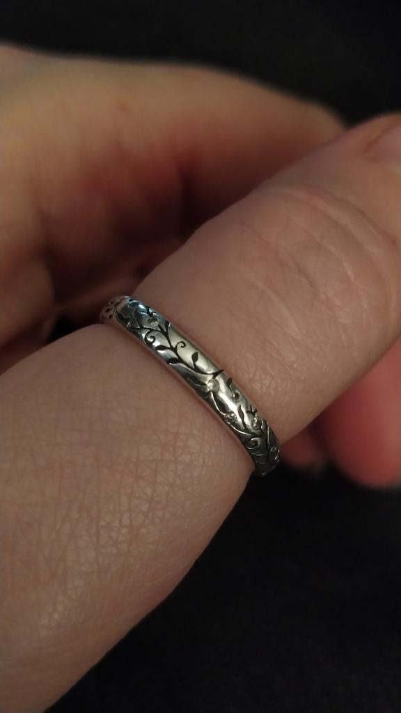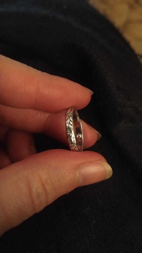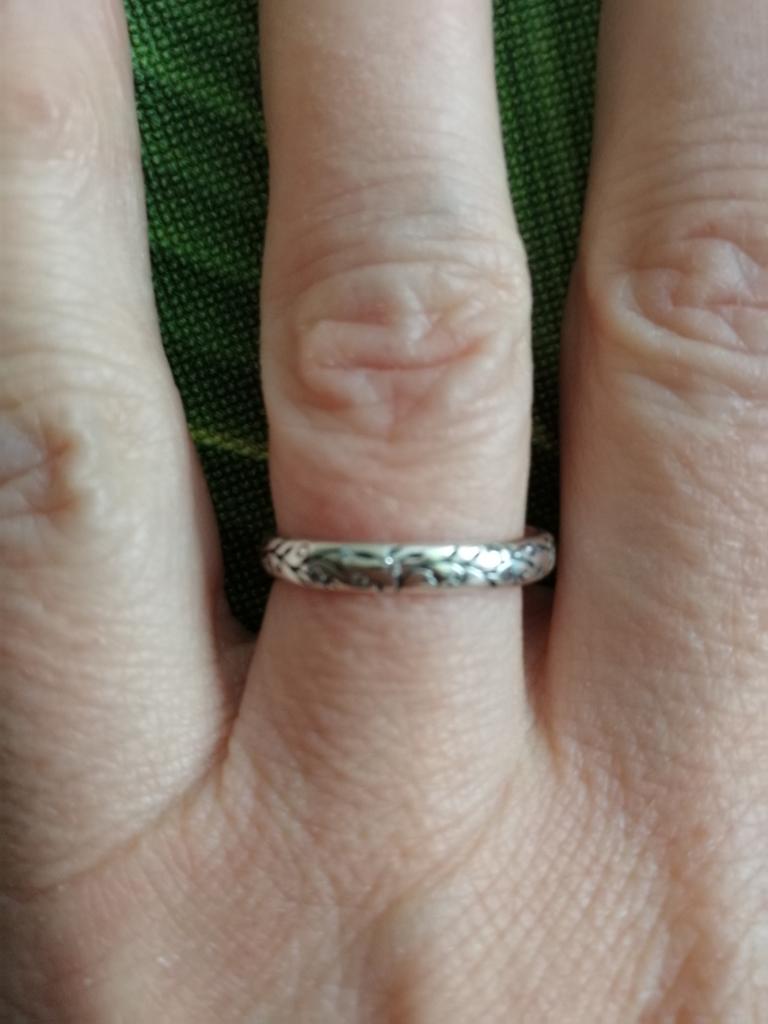 A very nice narrow ring, the pattern goes all the way around. Very nice! A small stamp can be seen in the ring. (last photo)