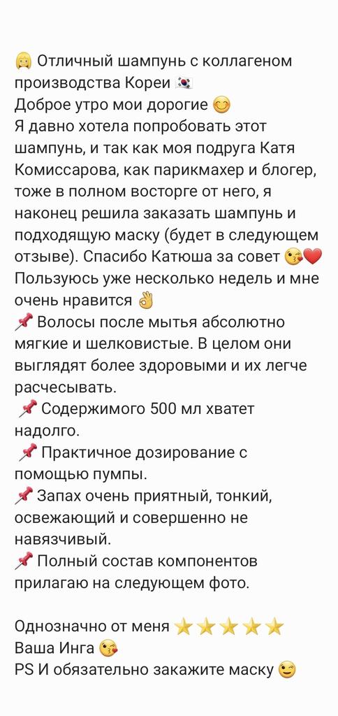 👱♀️ Tolles Collogen Shampoo made in Korea 🇰🇷 Good morning my loves 😊 I've wanted to try this shampoo for a long time and since my friend Katja Komissarova, as a hairdresser and blogger, is also totally enthusiastic about it, I finally made the decision to order the shampoo and the matching mask (will be in the next review).. I've been using it for several weeks now and I absolutely love it 👌 📌 The hair is totally soft and supple after washing. They look healthier overall and are easier to comb through. 📌 The content of 500 ml is enough for a long time. 📌 Practical dosing with the help of a pump. 📌 I have added the composition and the fabrics in the next photo. 📌 The scent is very pleasant, fine, refreshing and not intrusive at all. Definitely from me ⭐️ ⭐️ ⭐️ ⭐️ ⭐️ Your Inge 😘 PS And definitely order the mask 😉