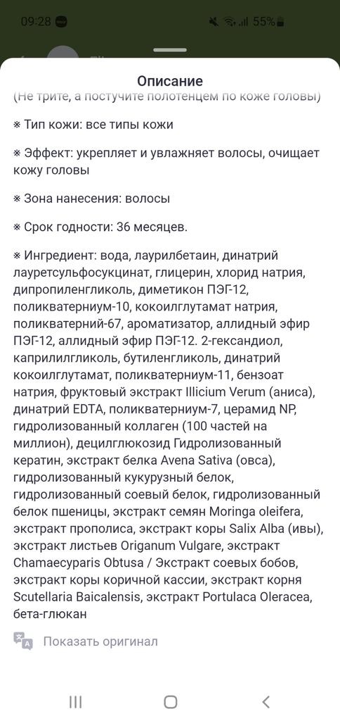 Very good shampoo. After it, the hair is soft, easy to comb and have a shine. The smell is gentle, pleasant. I have been using Korean products for a very long time for almost 5 years, namely body care. This shampoo is one of my favorites in my collection. I have sensitive scalp and closer to dry hair type. I bought shampoos in a place with a mask of the same brand.