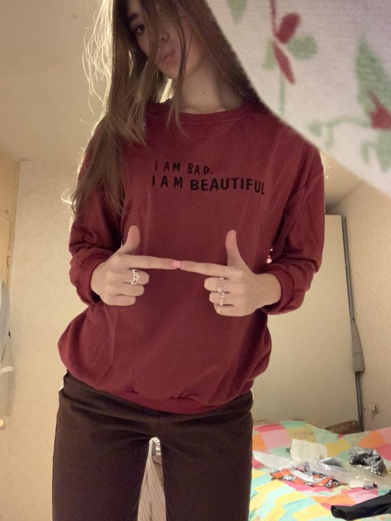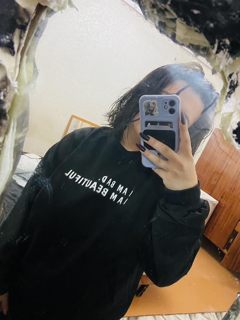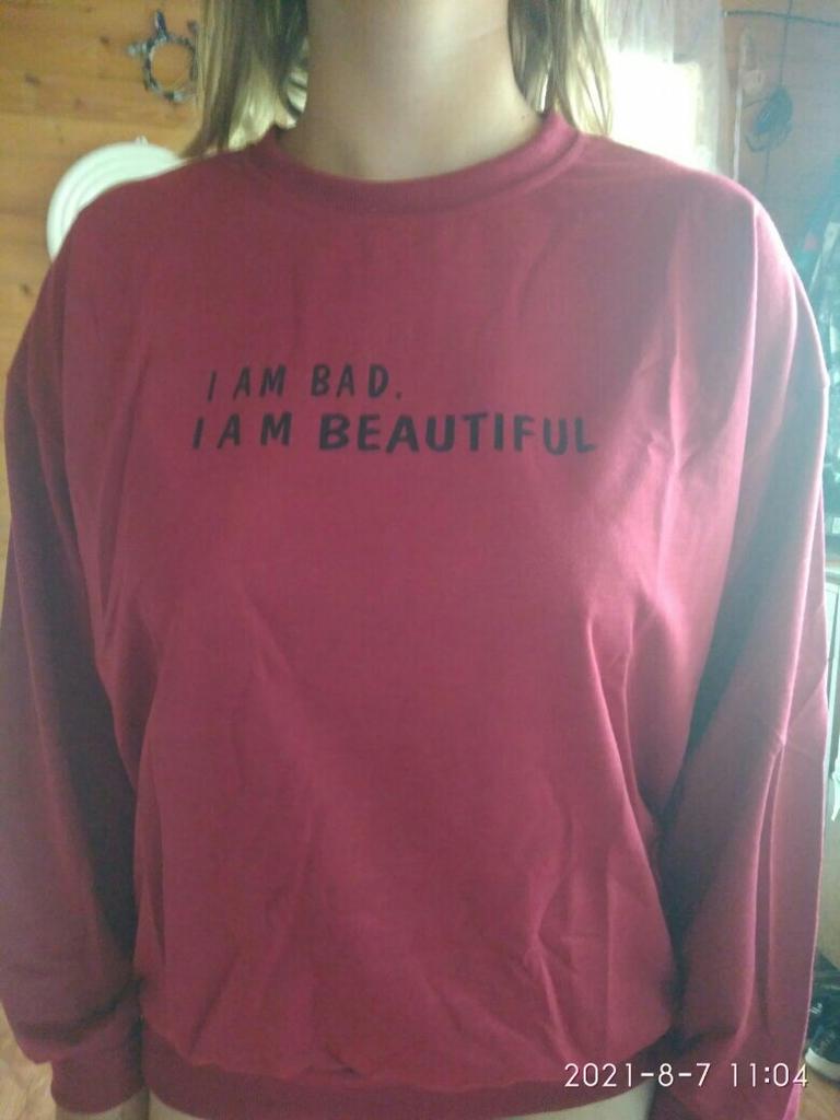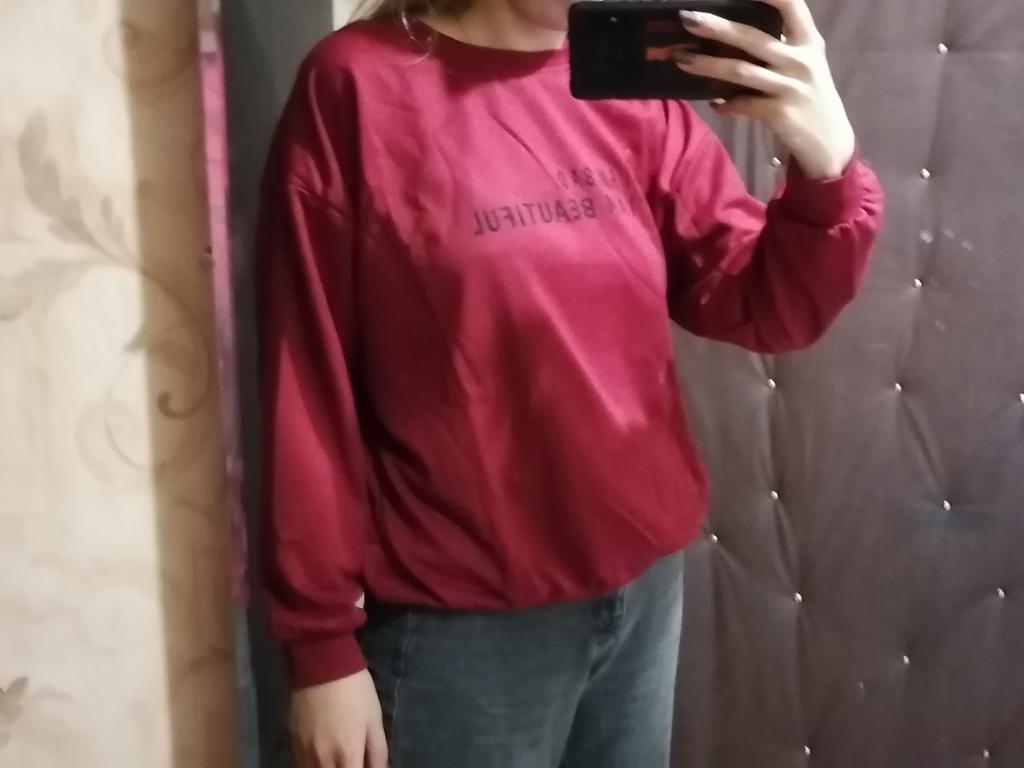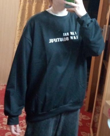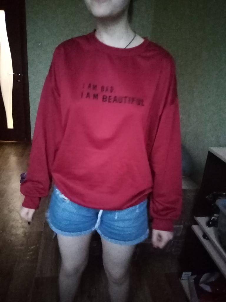 It was necessary to take a larger size, it does not look quite oversized, but in principle it is normal. I will wear It is a pity that it is very thin. But the color is bomb! And what about the good quality of the inscription, as long as it does not peel off.