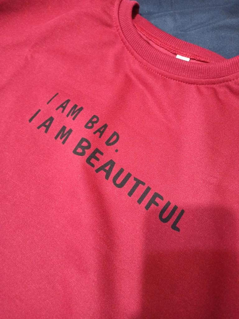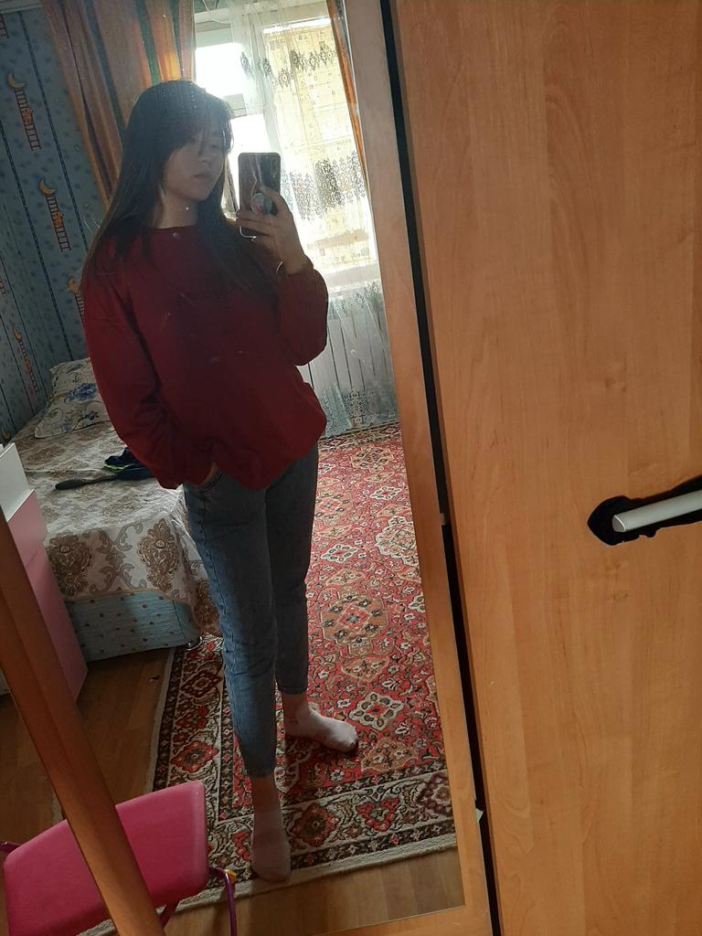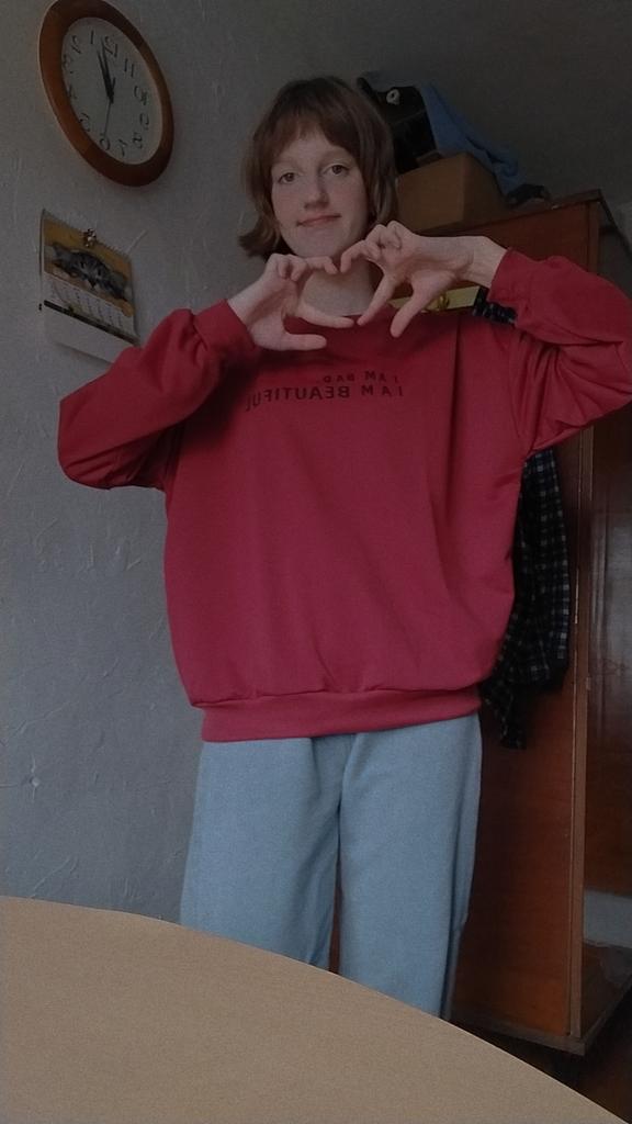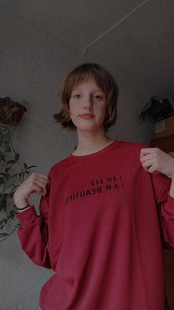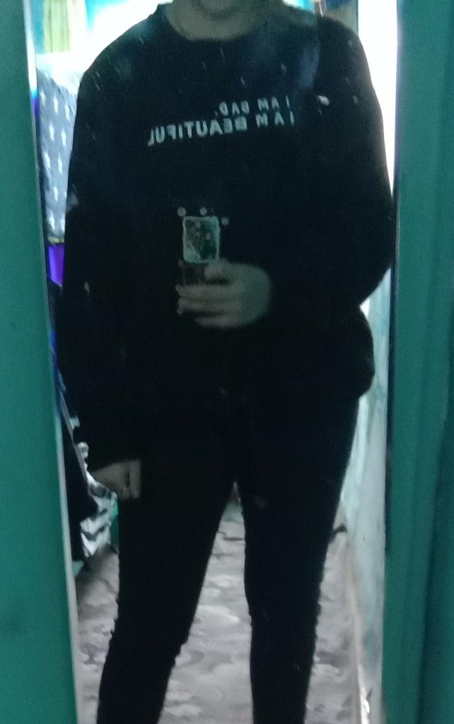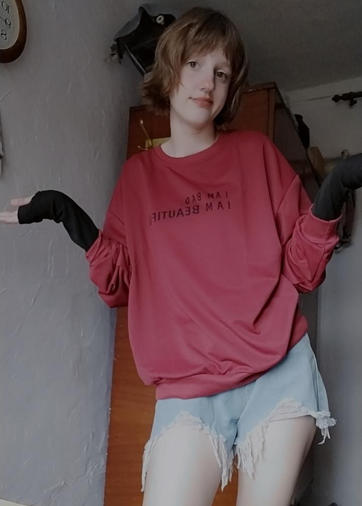 It was necessary to take a larger size, it does not look quite oversized, but in principle it is normal. I will wear It is a pity that it is very thin. But the color is bomb! And what about the good quality of the inscription, as long as it does not peel off.