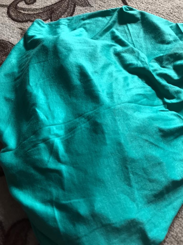 This scarf is an incredible emerald color. The quality is good. Perfect for Muslim hijab. It is soft and does not slip. Photo a little later.