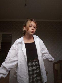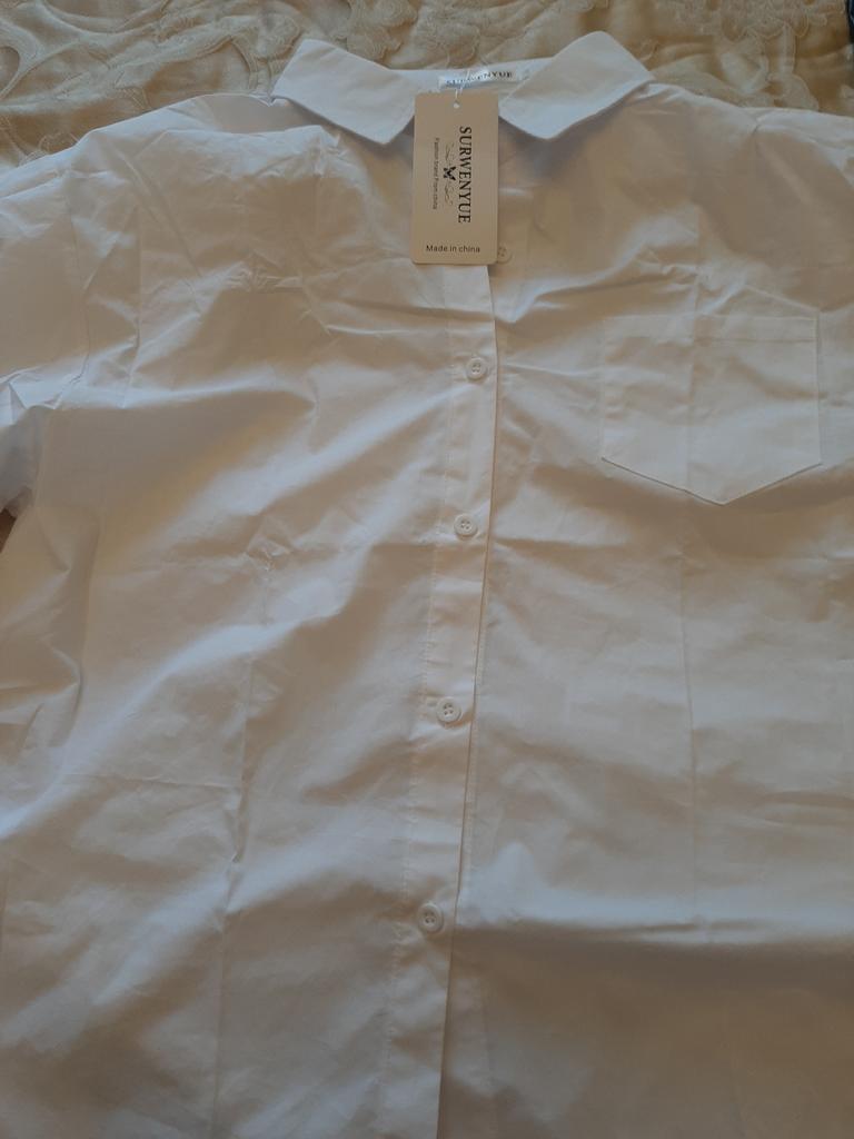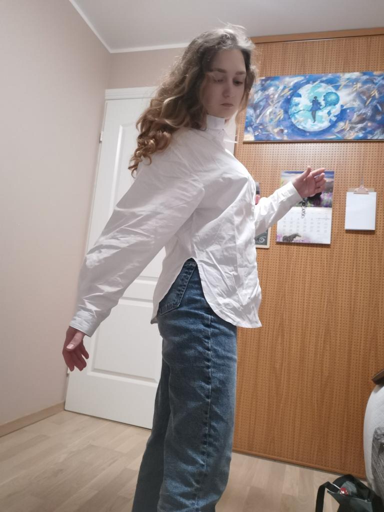 Cotton shirt, regular. Well sewn. But the slits on the sides are sooooo high, there is no way to tuck the shirt into the waistband: neither all the way, nor just the front. Therefore return.