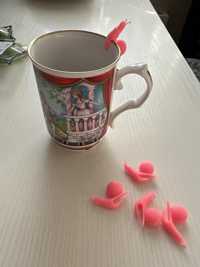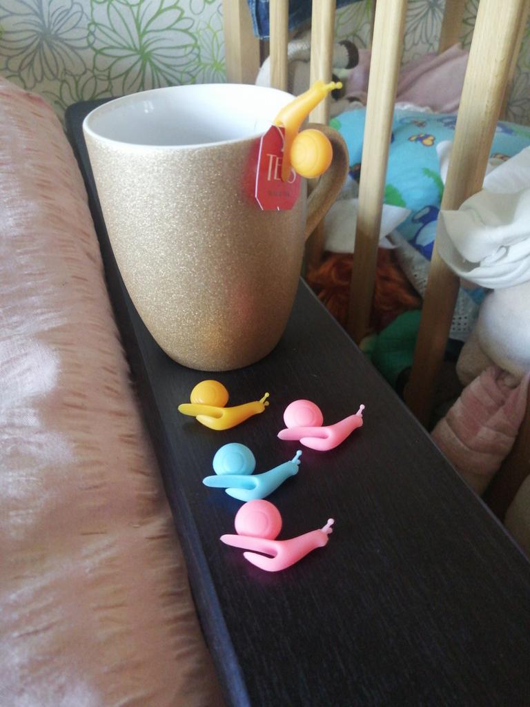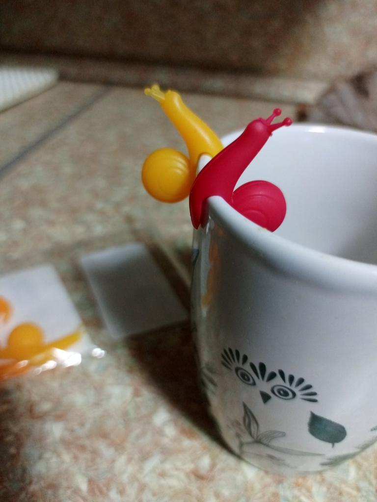 It's a pity that 4 out of 5 snails are the same color. Porcelain cups don't stick well. Apparently designed for thick earthenware cups.
