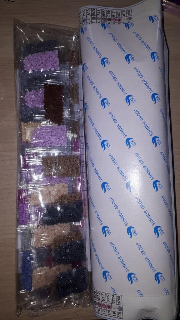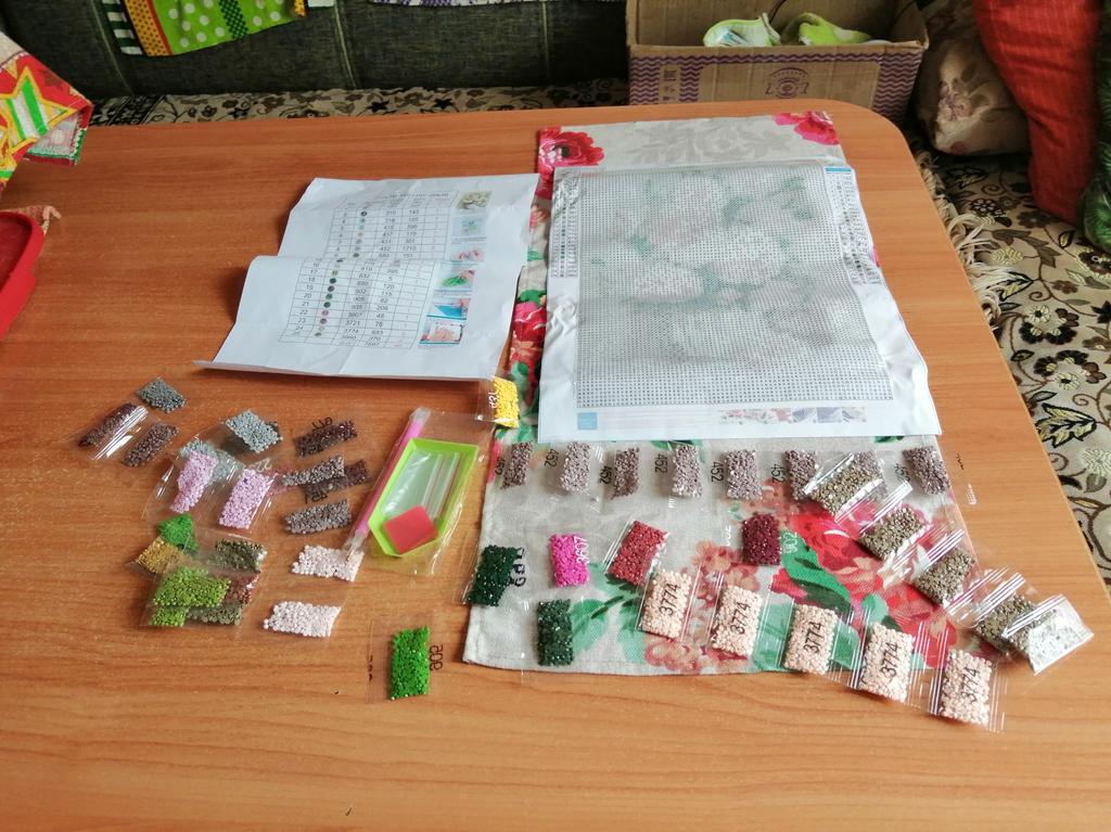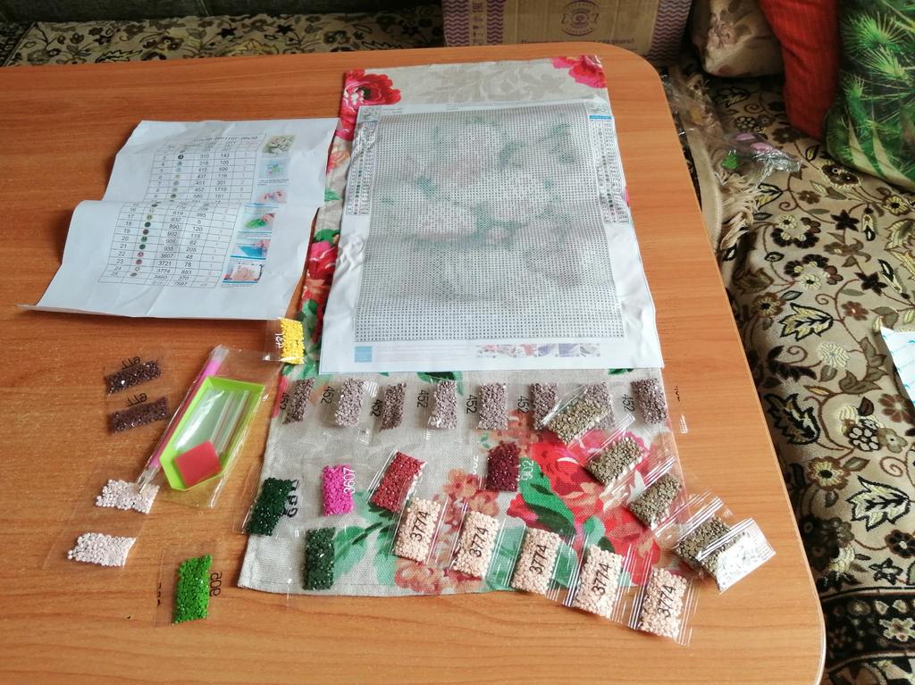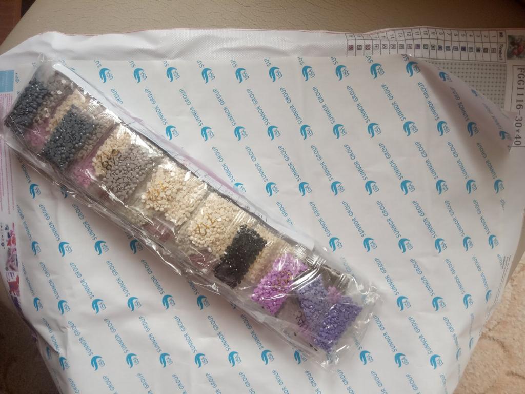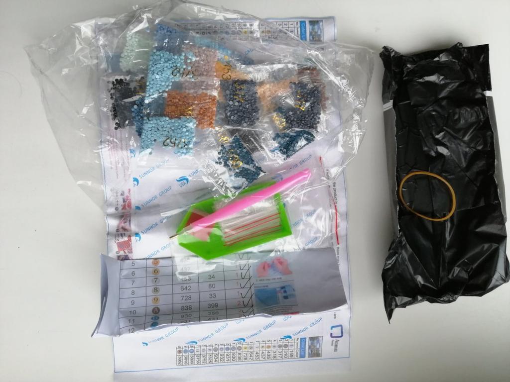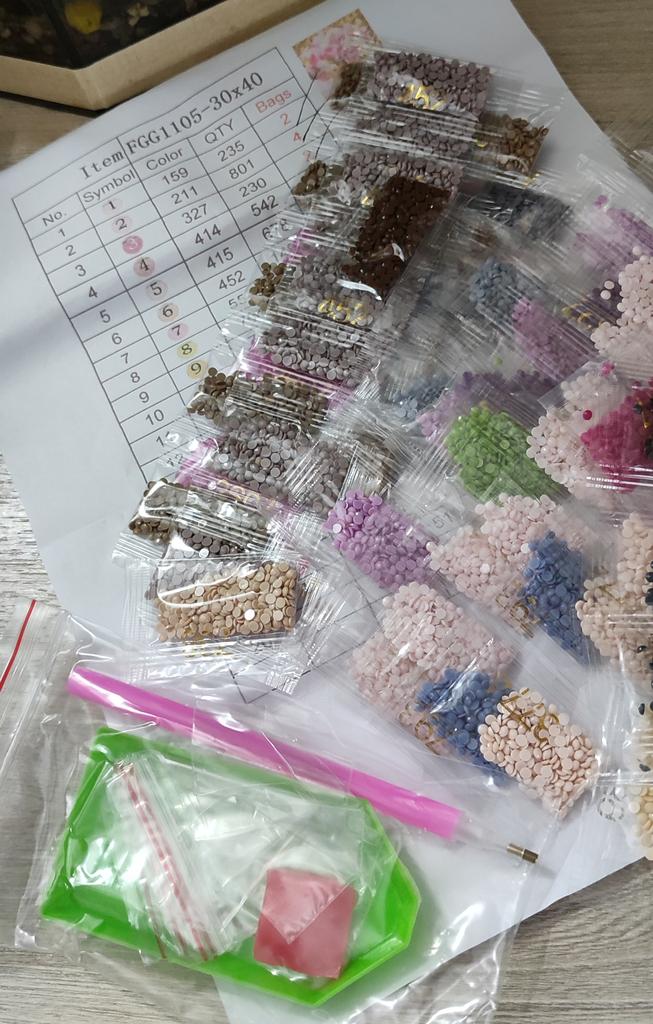 Everything arrived on time. The picture is a little crumpled, but it straightened out under the press. šø The scheme is printed with high quality. šø All colors are available, their colors match. šø The set also includes a pen for laying out, dry glue, a plate, and 4 zip bags. There seem to be a lot of pebbles, so I hope there will be enough of them. The picture is finished. It turned out quite cute. There are still many diamonds left