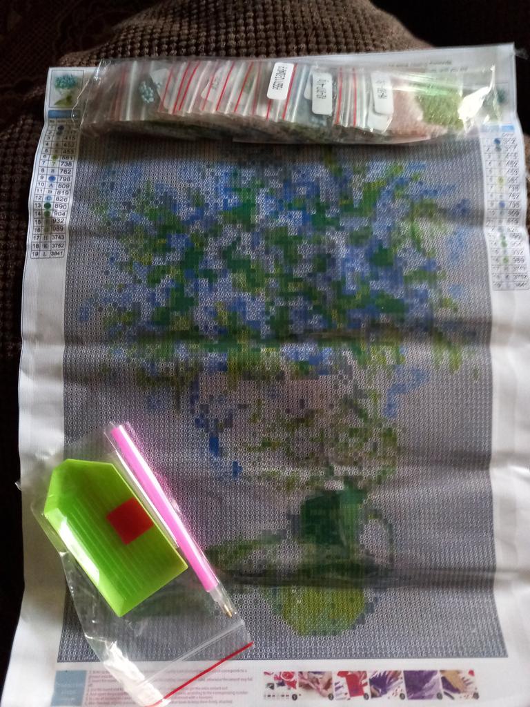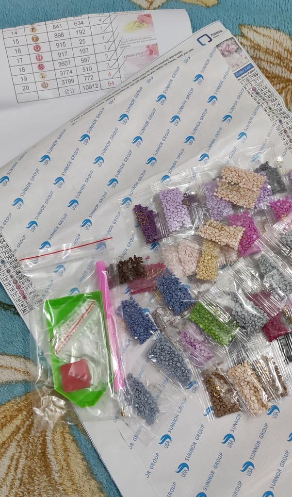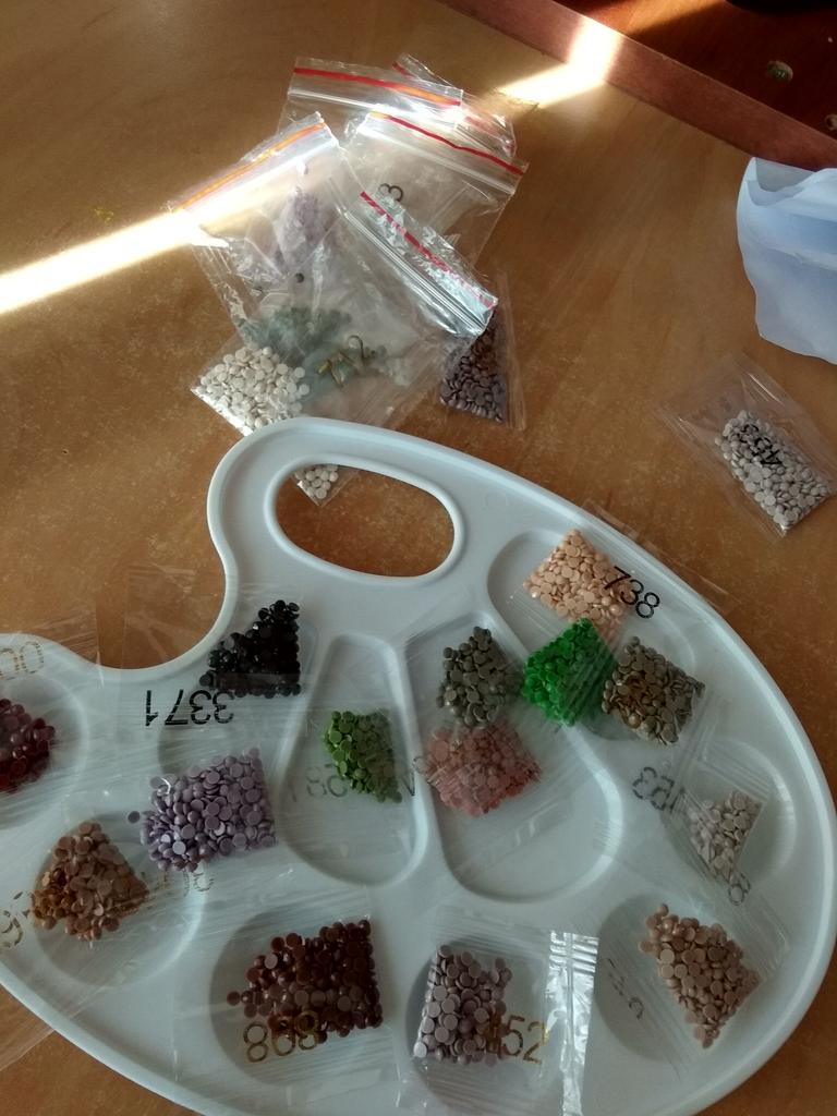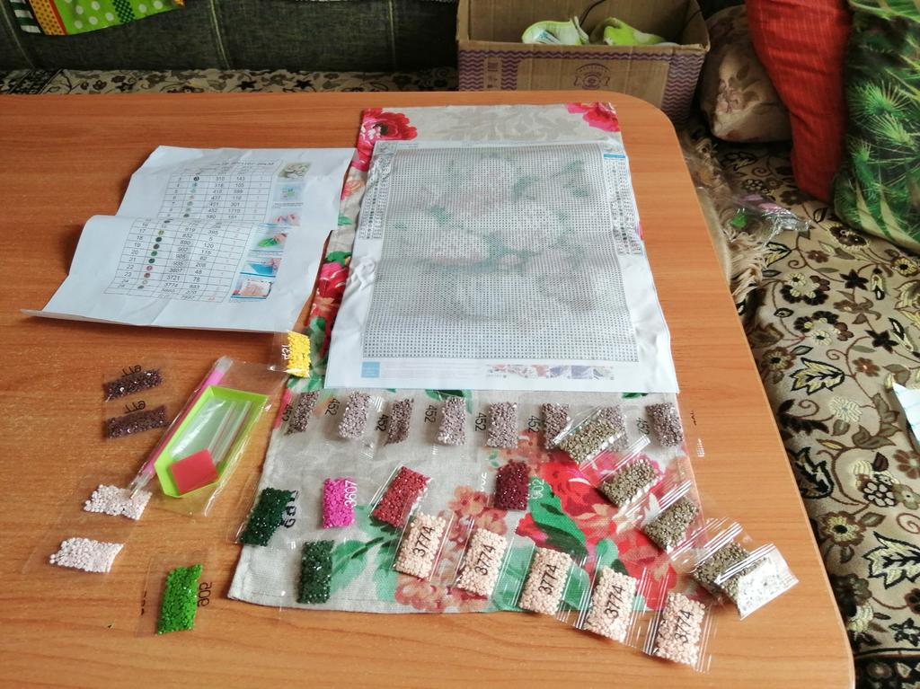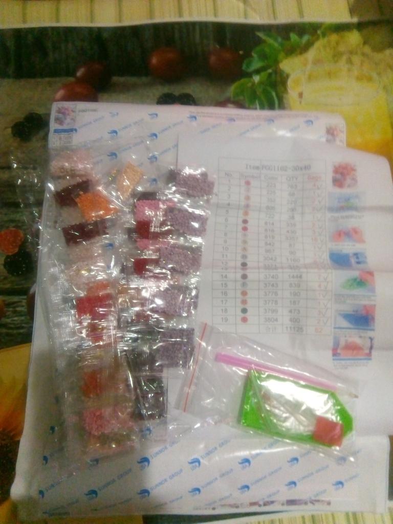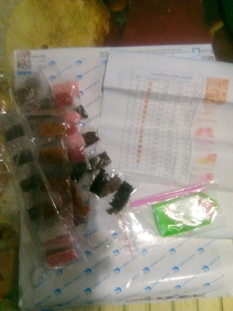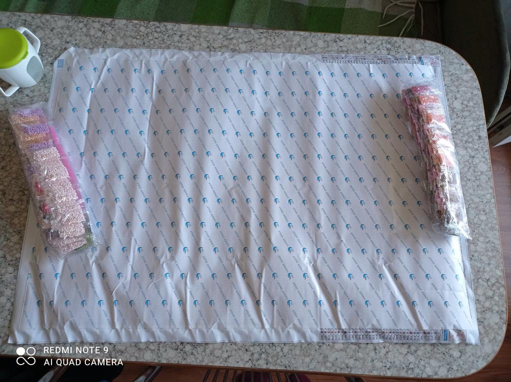Everything arrived on time. The picture is a little crumpled, but it straightened out under the press. šø The scheme is printed with high quality. šø All colors are available, their colors match. šø The set also includes a pen for laying out, dry glue, a plate, and 4 zip bags. There seem to be a lot of pebbles, so I hope there will be enough of them. The picture is finished. It turned out quite cute. There are still many diamonds left