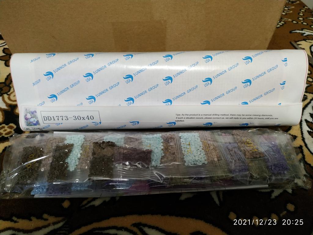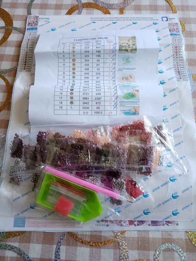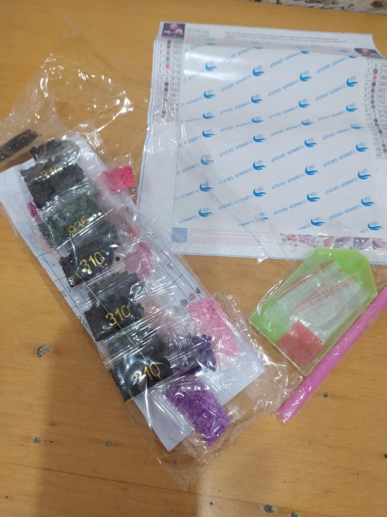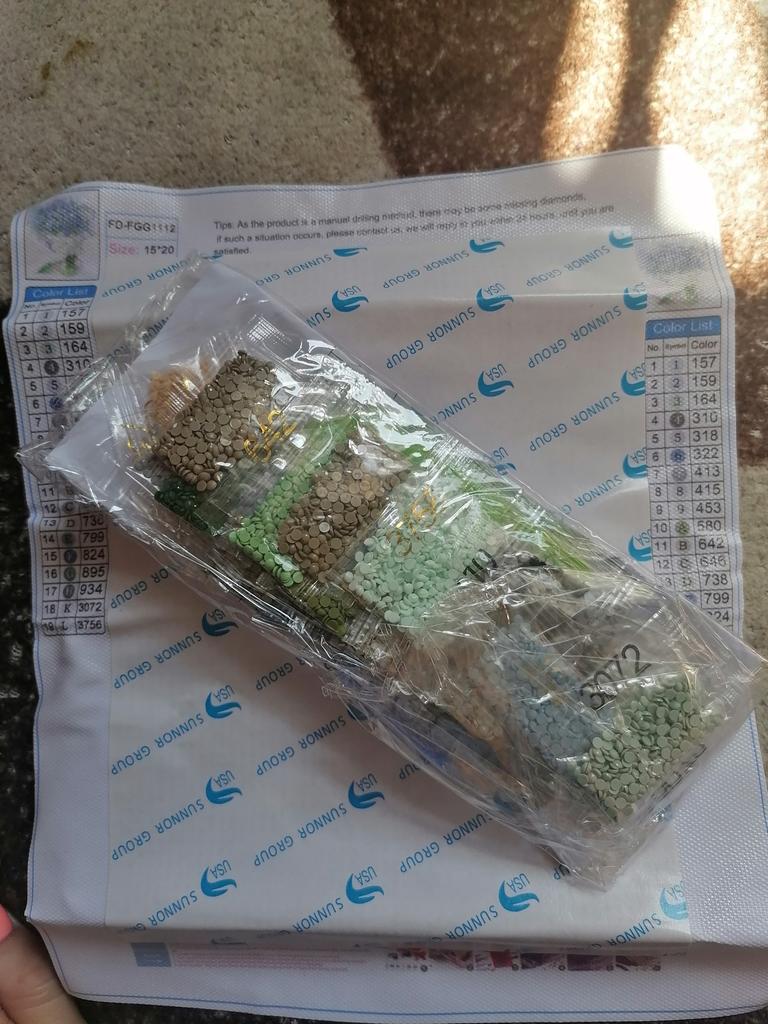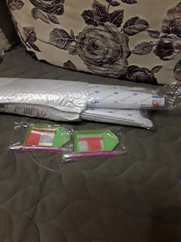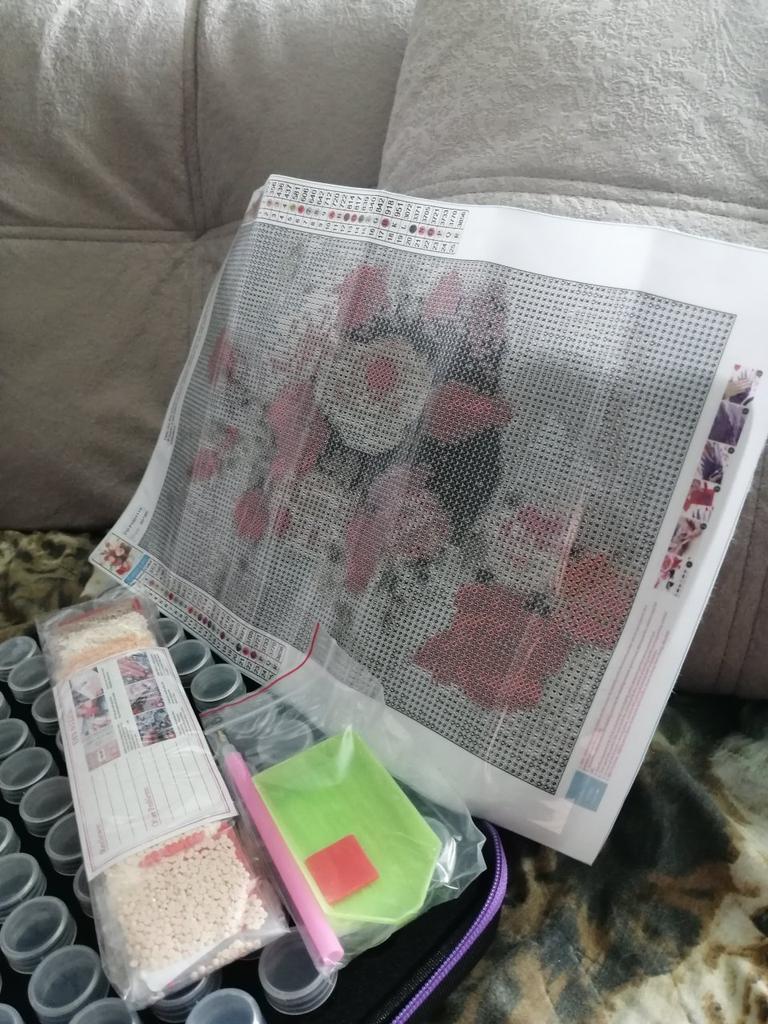 Everything arrived on time. The picture is a little crumpled, but it straightened out under the press. šø The scheme is printed with high quality. šø All colors are available, their colors match. šø The set also includes a pen for laying out, dry glue, a plate, and 4 zip bags. There seem to be a lot of pebbles, so I hope there will be enough of them. The picture is finished. It turned out quite cute. There are still many diamonds left
