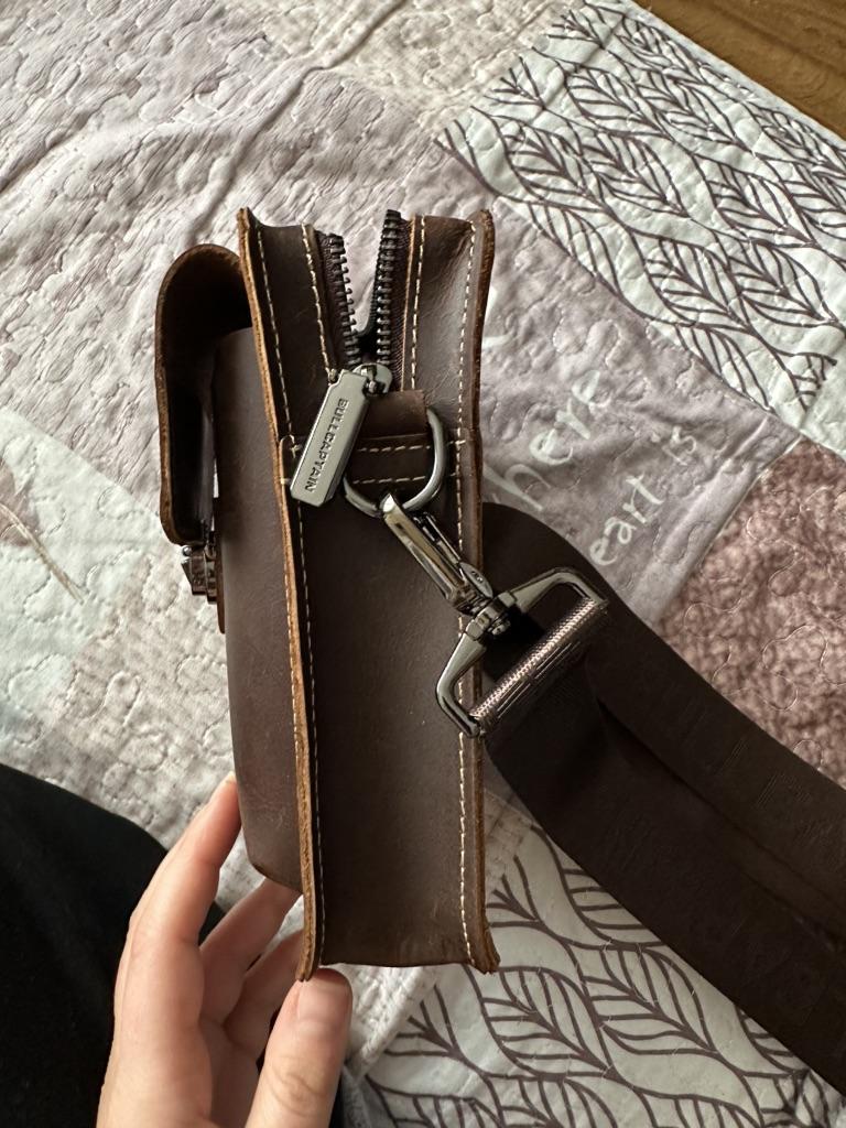 Cute leather handbag. Several options for wearing - on the belt or over the shoulder. Arrived intact, accessories work well. Thank you.