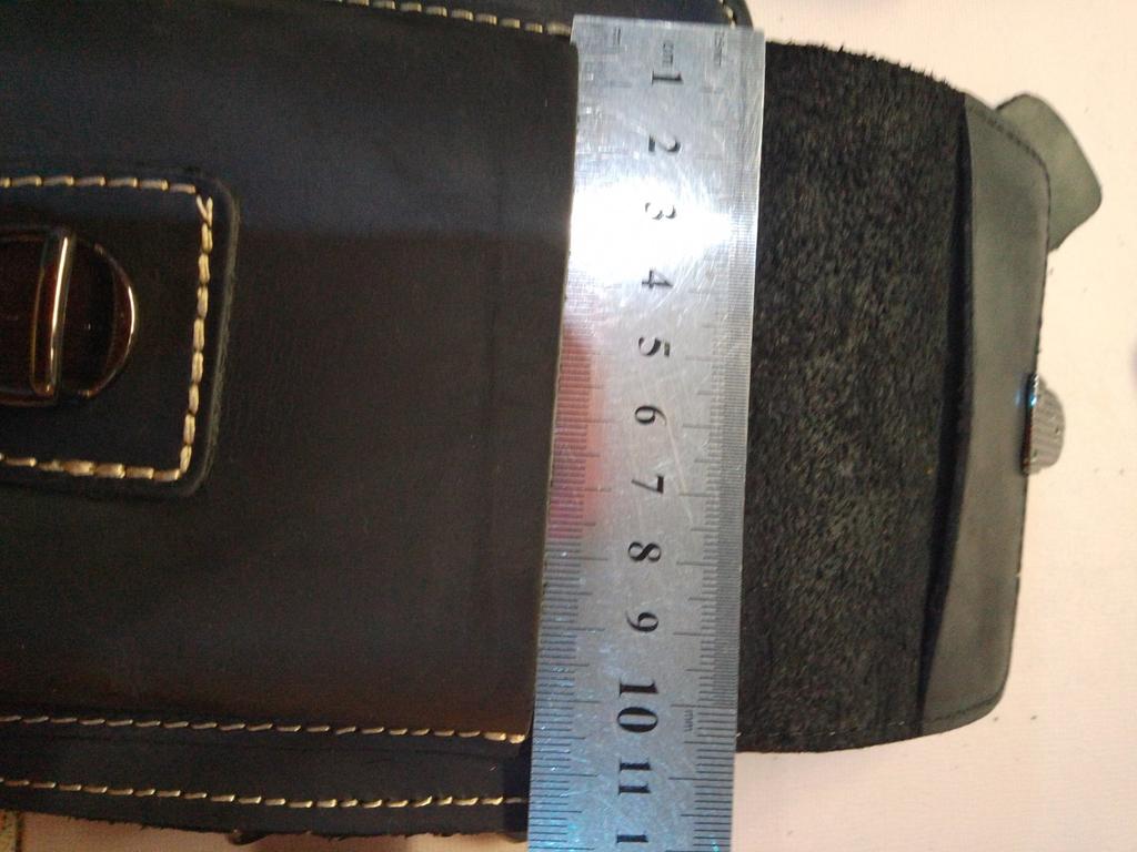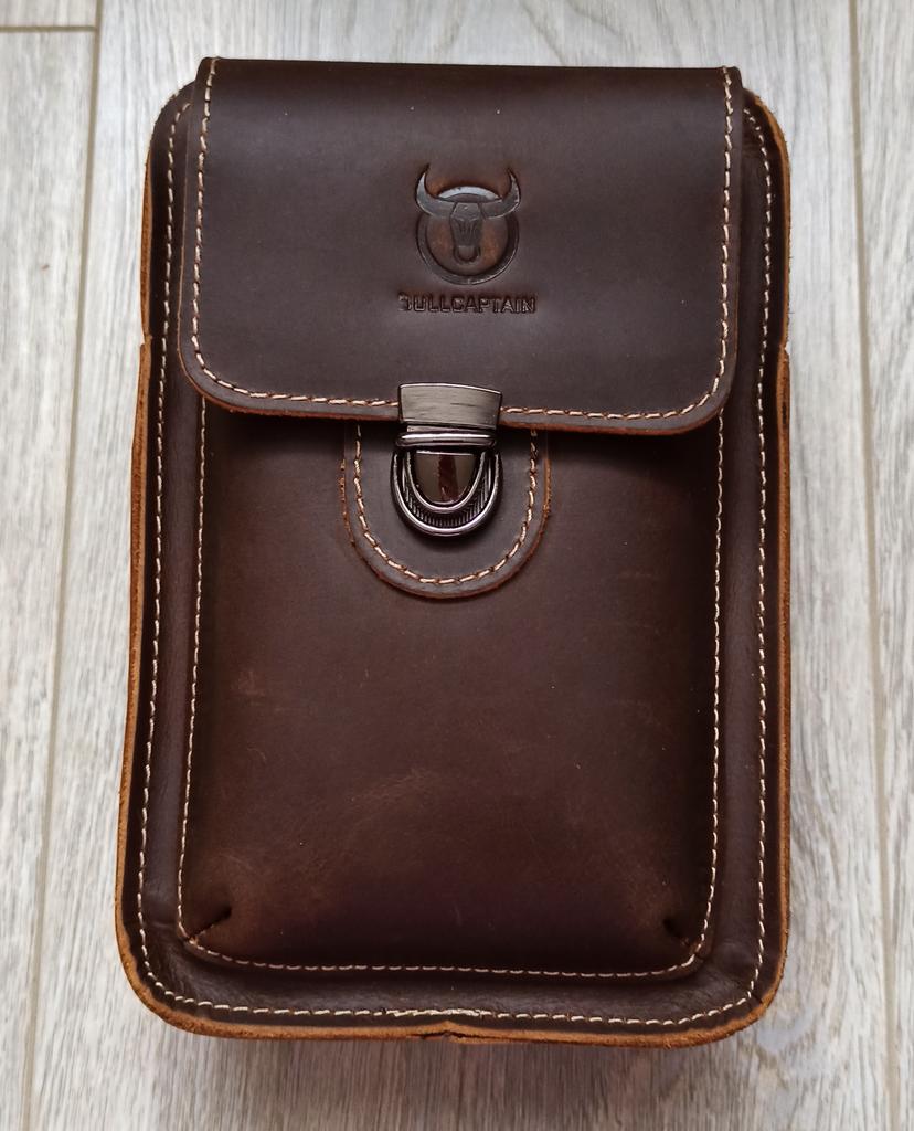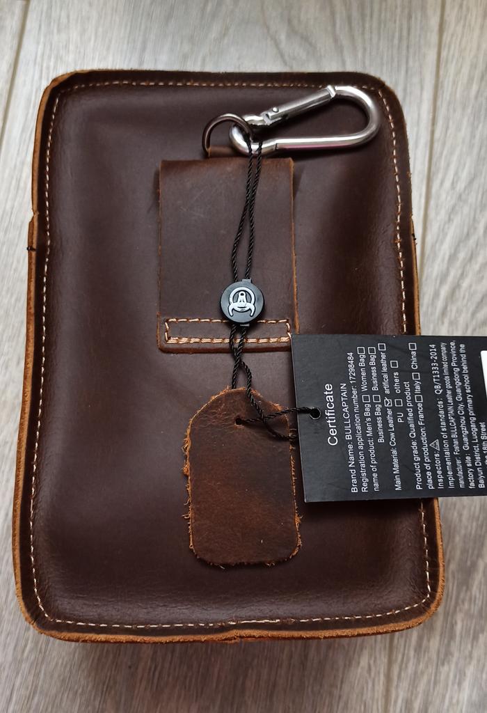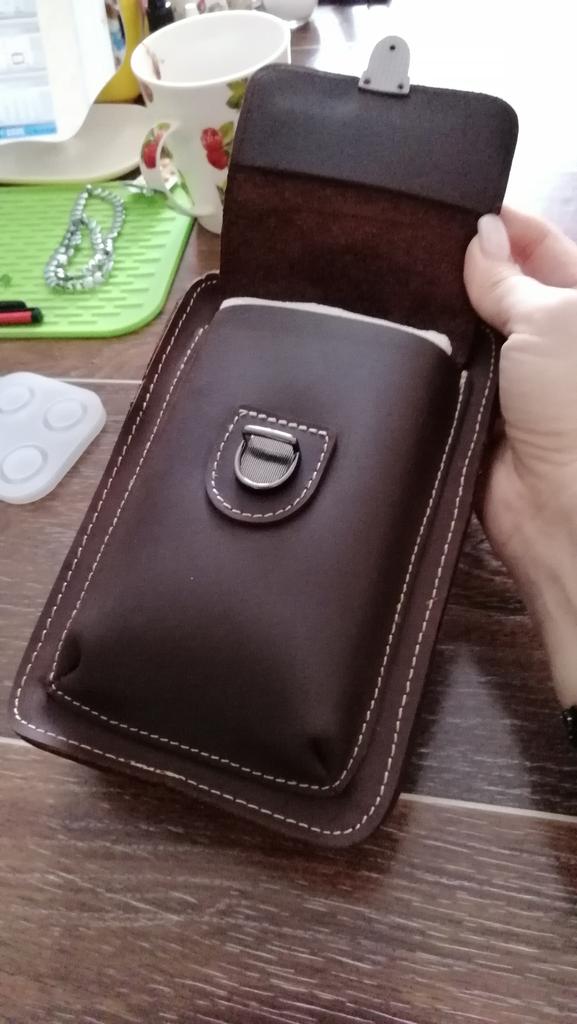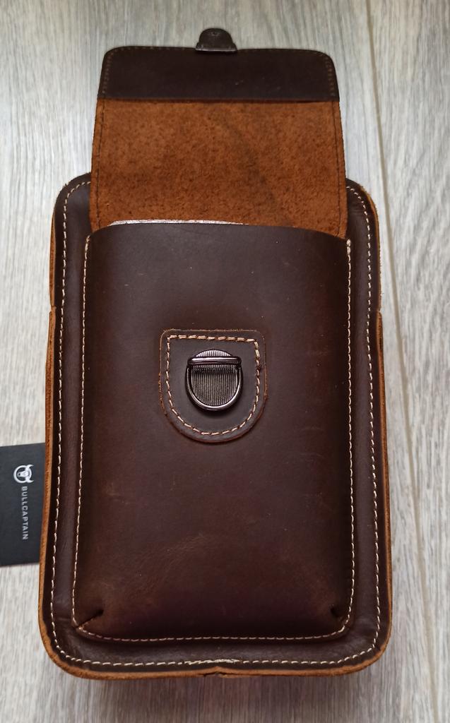 The leather is thick natural, the bag is not big, the outer pocket is just for the phone in the case (screen 6 inches), the main department for a large purse and keys, can be worn on a trouser belt, great - I was looking for this.