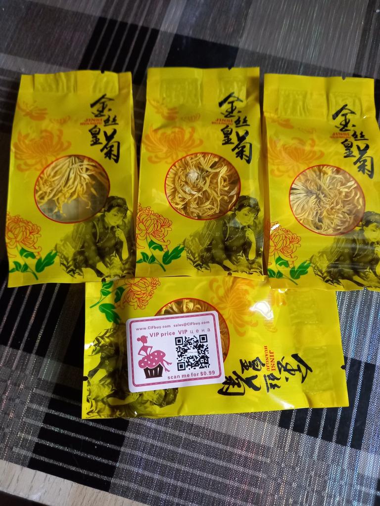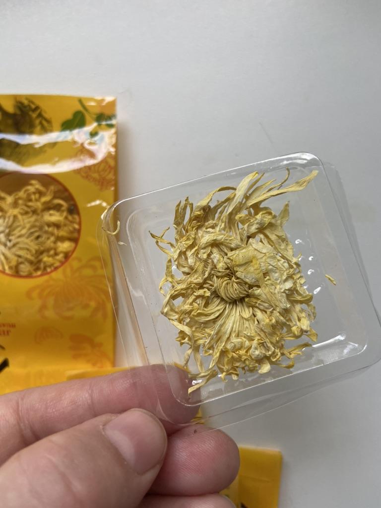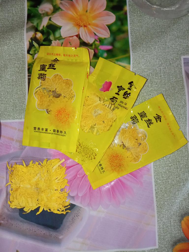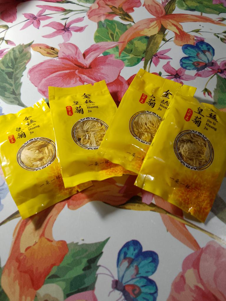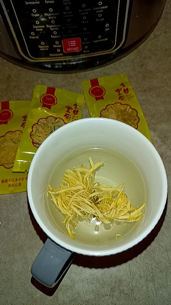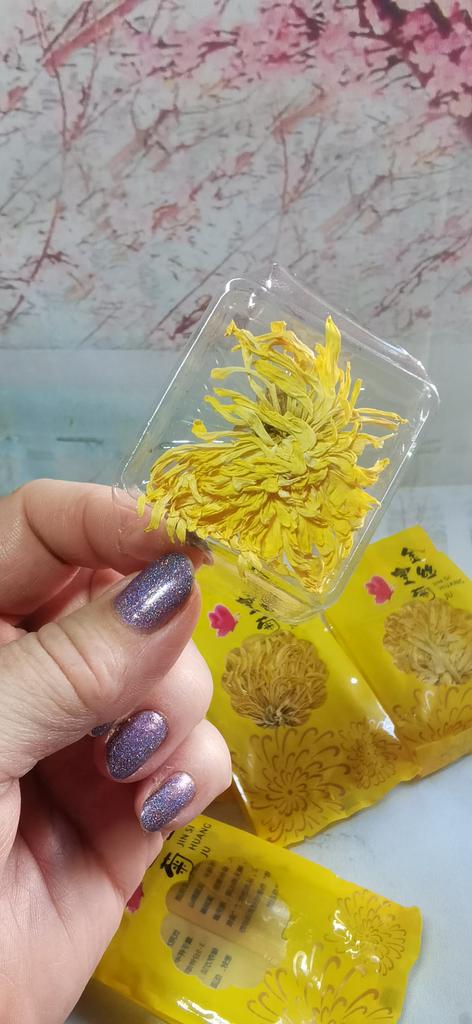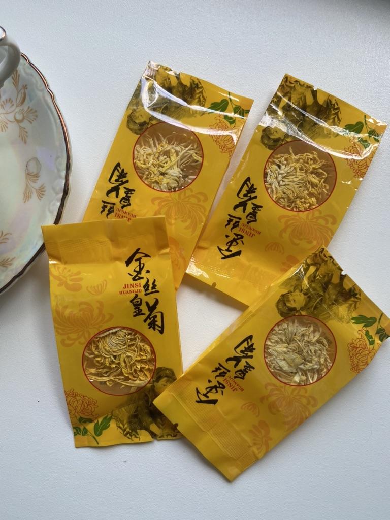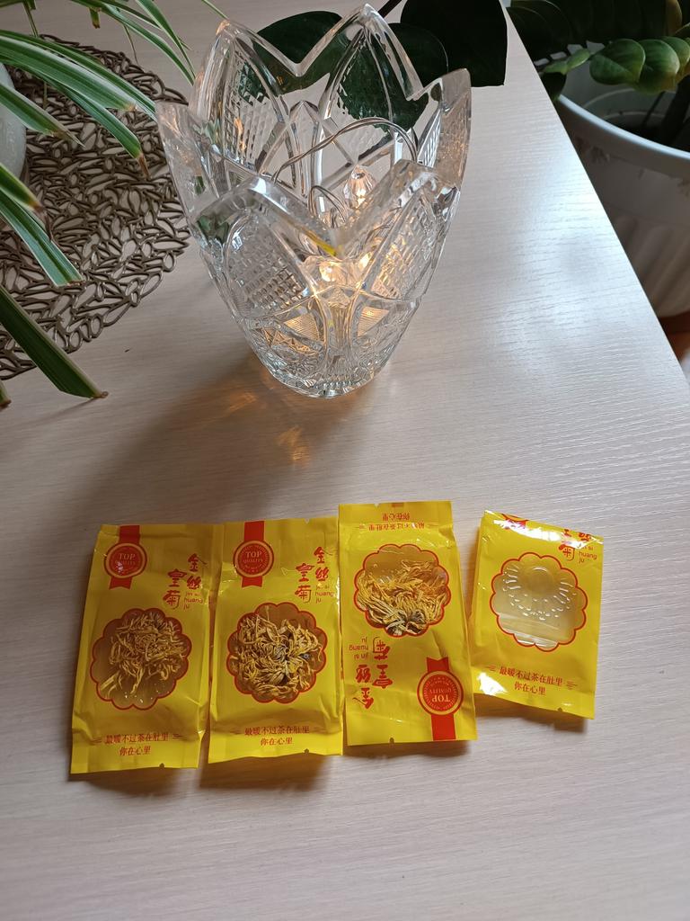 Tea with yellow chrysanthemum 4 sachets per set. Inside everyone is a real flower. The taste is pleasant, herbal with a hint of flowers.. Interesting. I like it.
